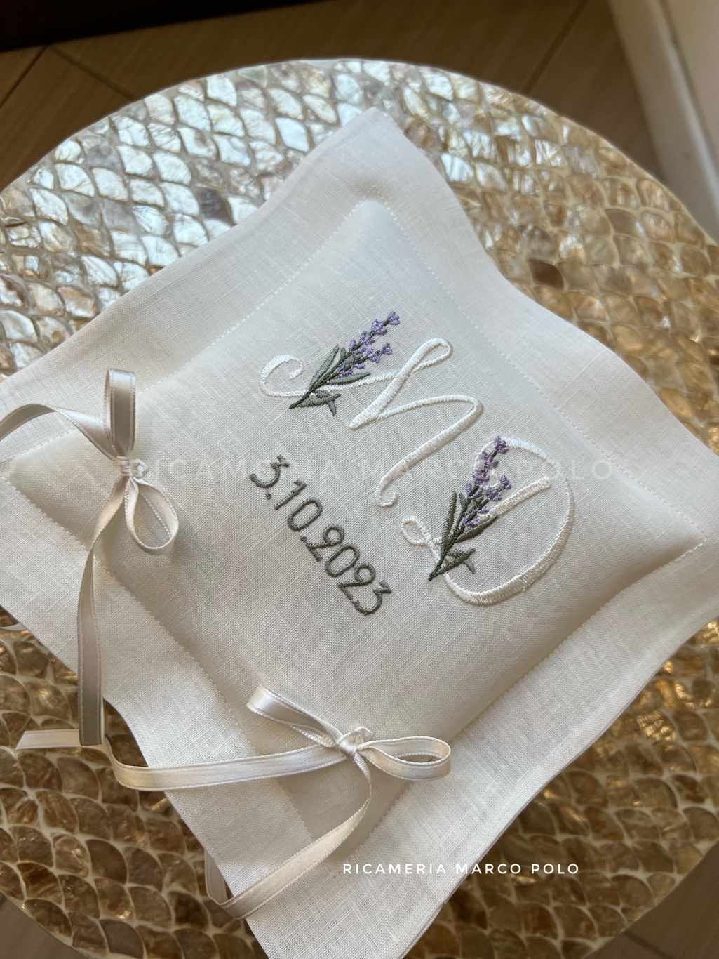 Rendi unico il momento dello scambio degli anelli con questo raffinato cuscino portafedi artigianale. Realizzato in lino di colore naturale, questo accessorio è perfetto per matrimoni dallo stile romantico, country chic o provenzale. Questo Portafedi è realizzato in purissimo lino panna, ha una forma quadrato, e oltre al ricamo delle iniziali panna degli sposi, c’è e un tocco di profumata lavanda. I Nastri 6 mm in doppio raso Italiano colore panna completano tutto.