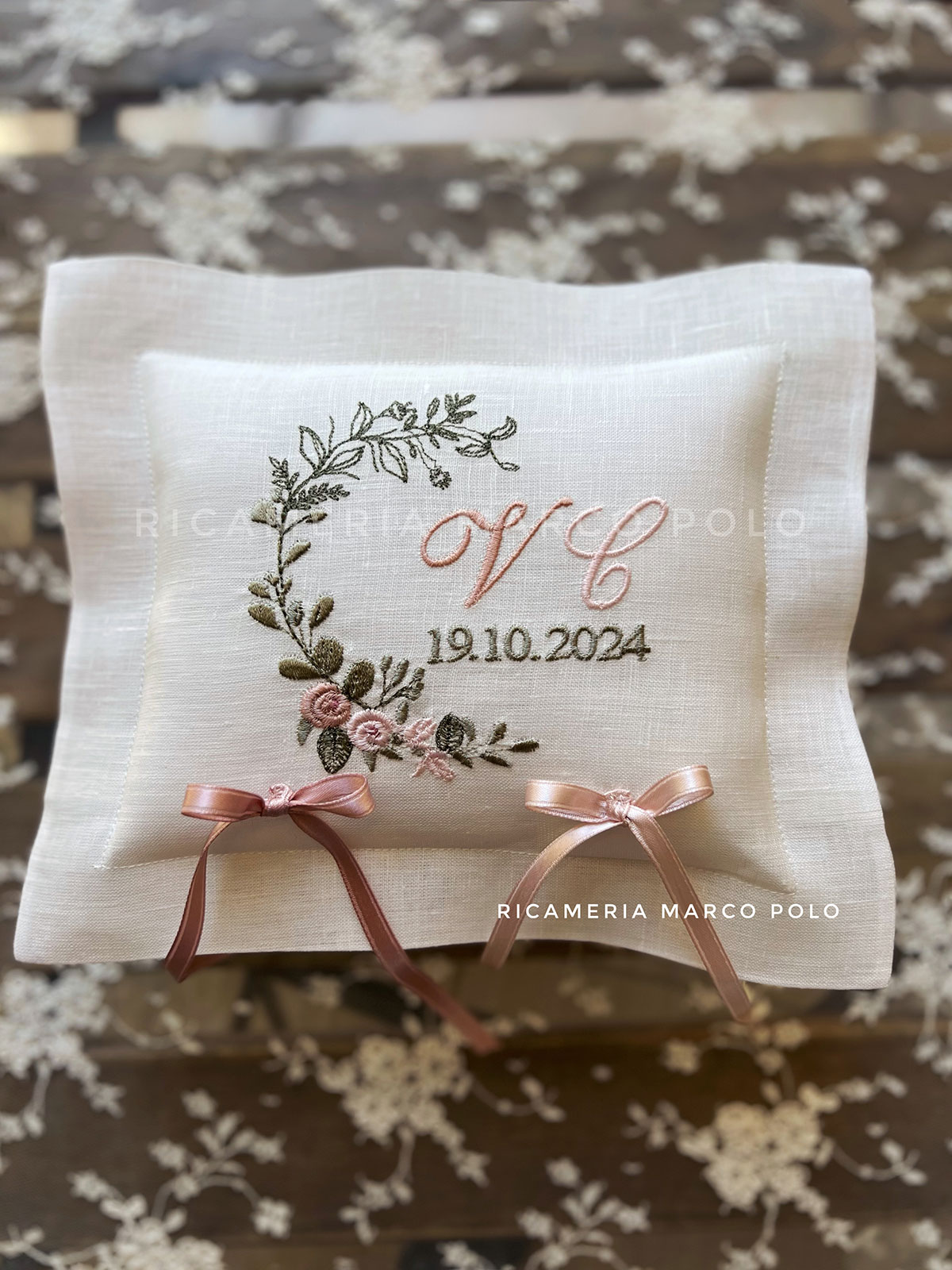 Portafedi in lino panna con ricamo tralcio di foglie e rose rosa cipria e rosa antico, ricamo data in verde. Nastri 6 mm in rosa cipria e rosa antico.