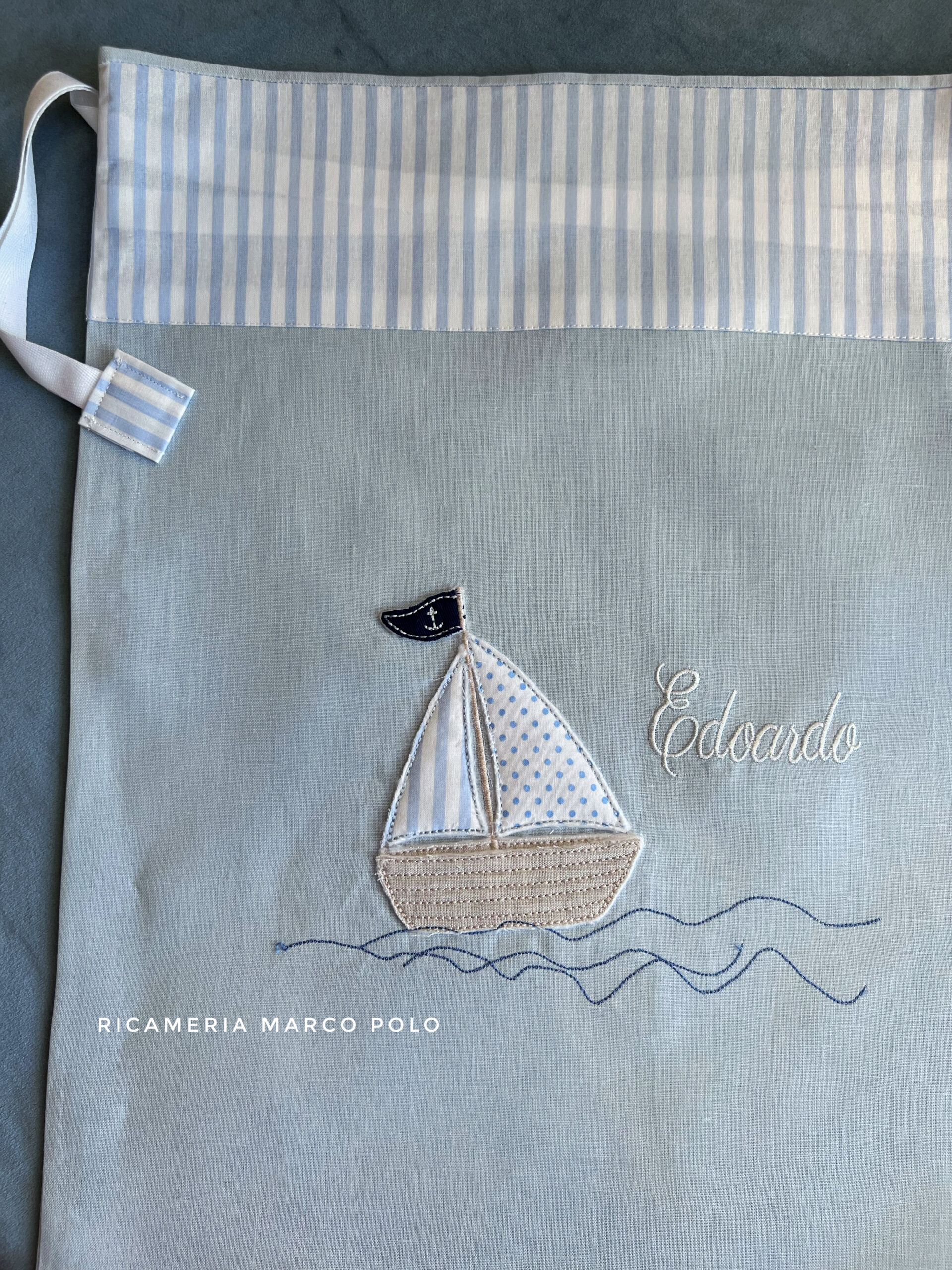 Sacca primo cambio in puro lino azzurro con barca a vela, mare e bandierina. personalizzabile