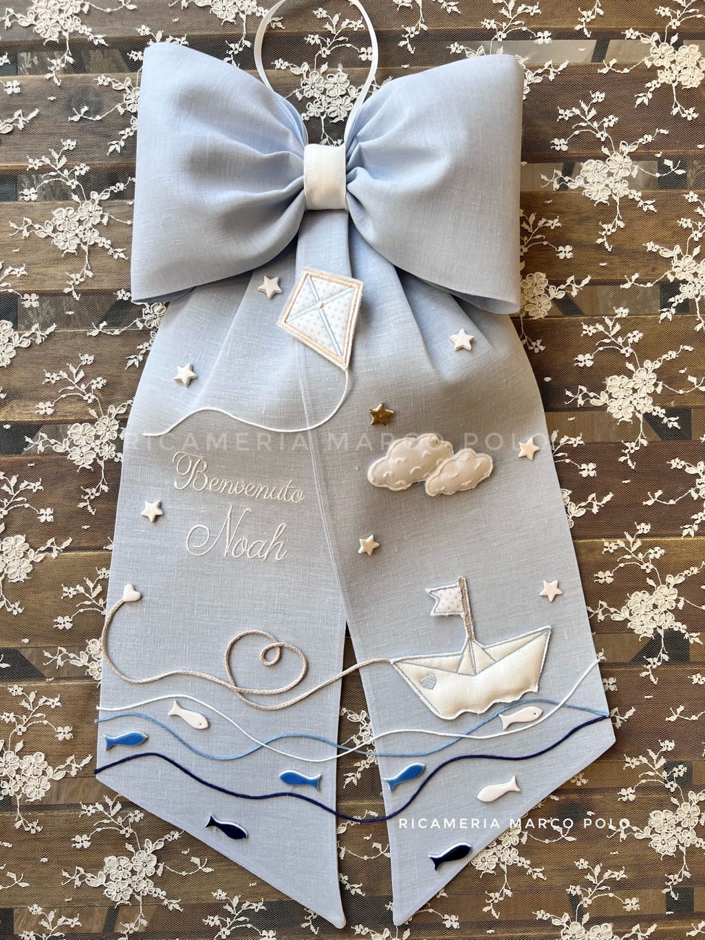 Barchetta e aquilone sono i protagonisti di questo fiocco nascita in lino celeste, ideale per dare il benvenuto a un nuovo arrivato con eleganza e fantasia.
