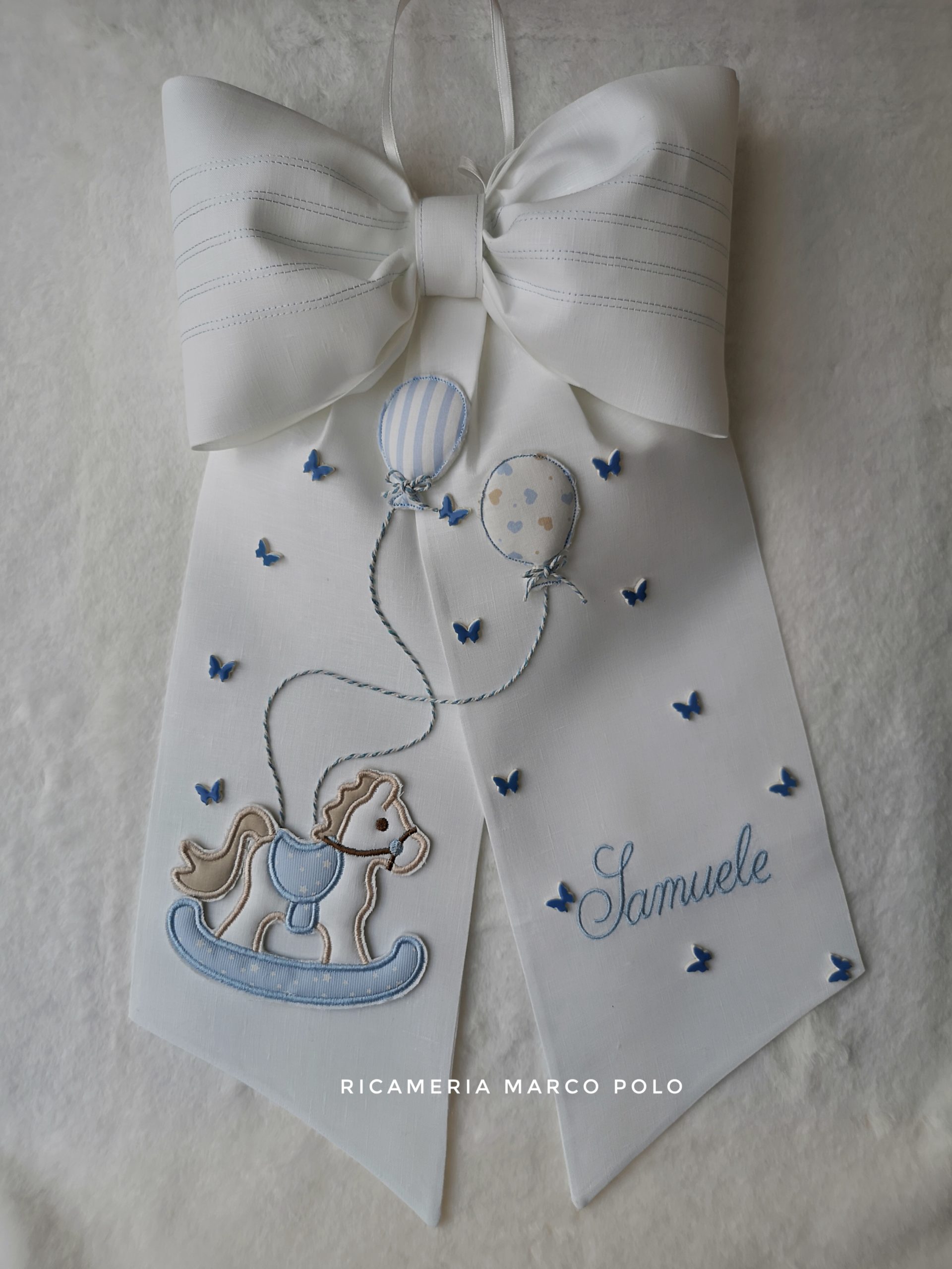 Fiocco nascita in purissimo lino panna. Il cavallo a dondolo è uno di quei giochi che più rappresenta la presenza di una tenera creatura in una casa. In questo fiocco abbiamo inserito un cavalluccio a cui sono legati due palloncini. cuciture sulla parte superiore