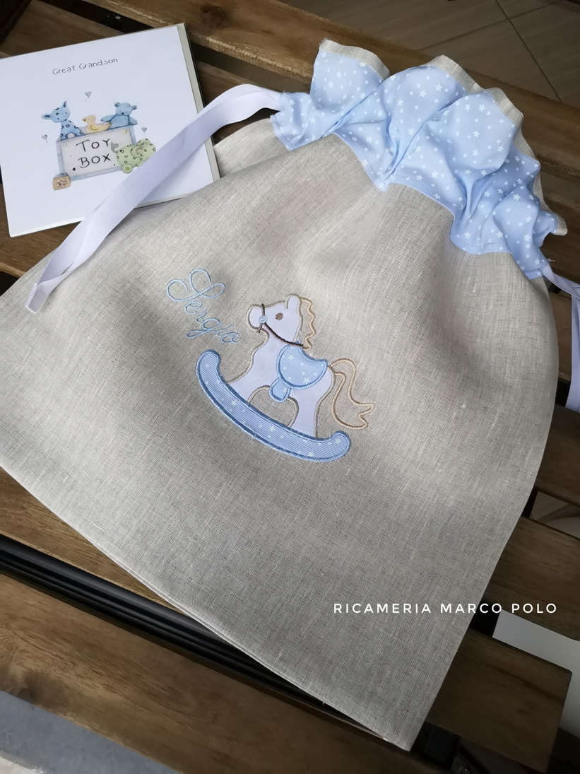 Sacca Primo cambio con il ricamo di un tenero cavalluccio con una fascia celeste a stelline. personalizzabile
