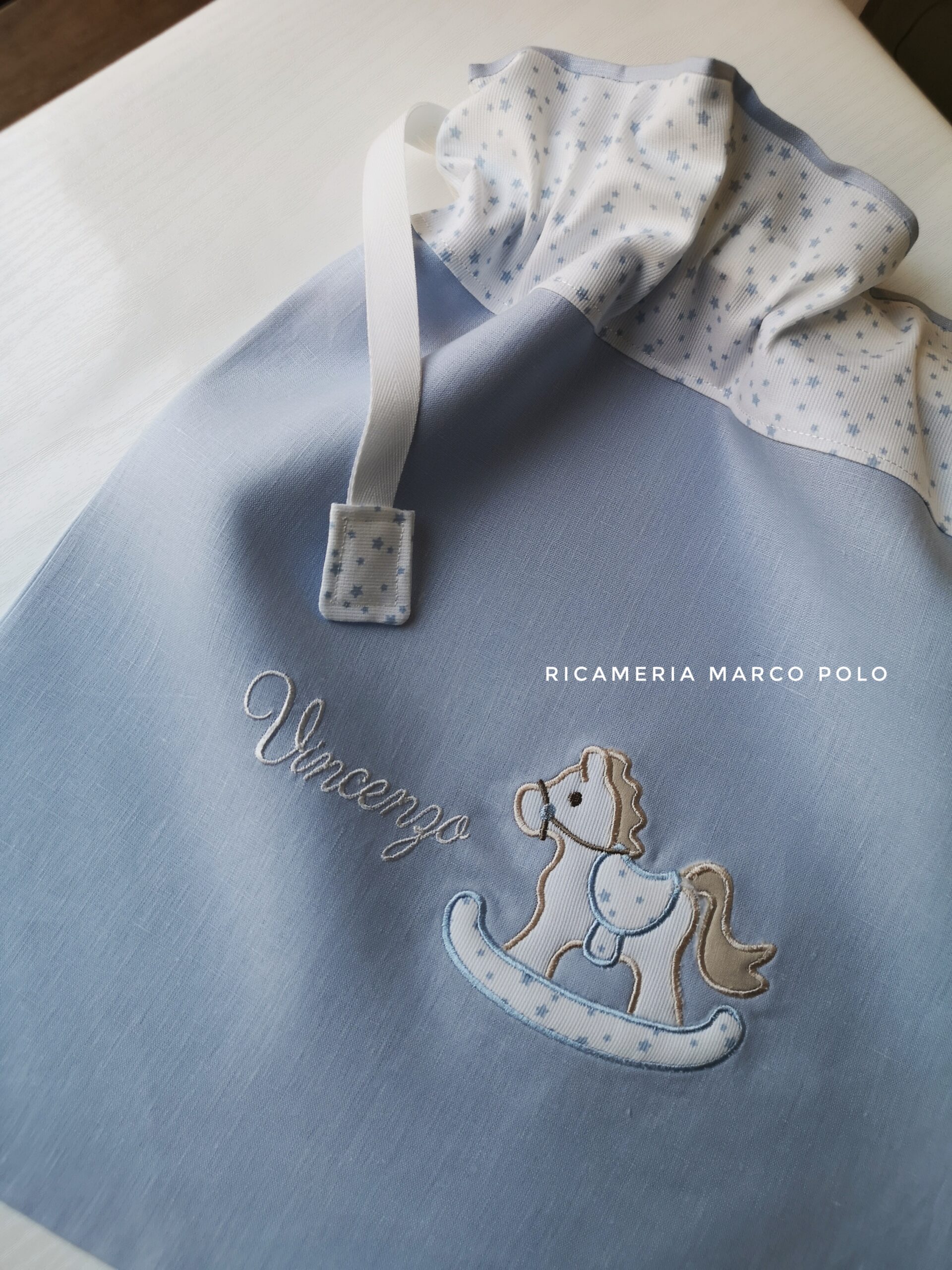Sacca Primo cambio con il ricamo di un tenero cavalluccio con una fascia celeste a stelline. personalizzabile