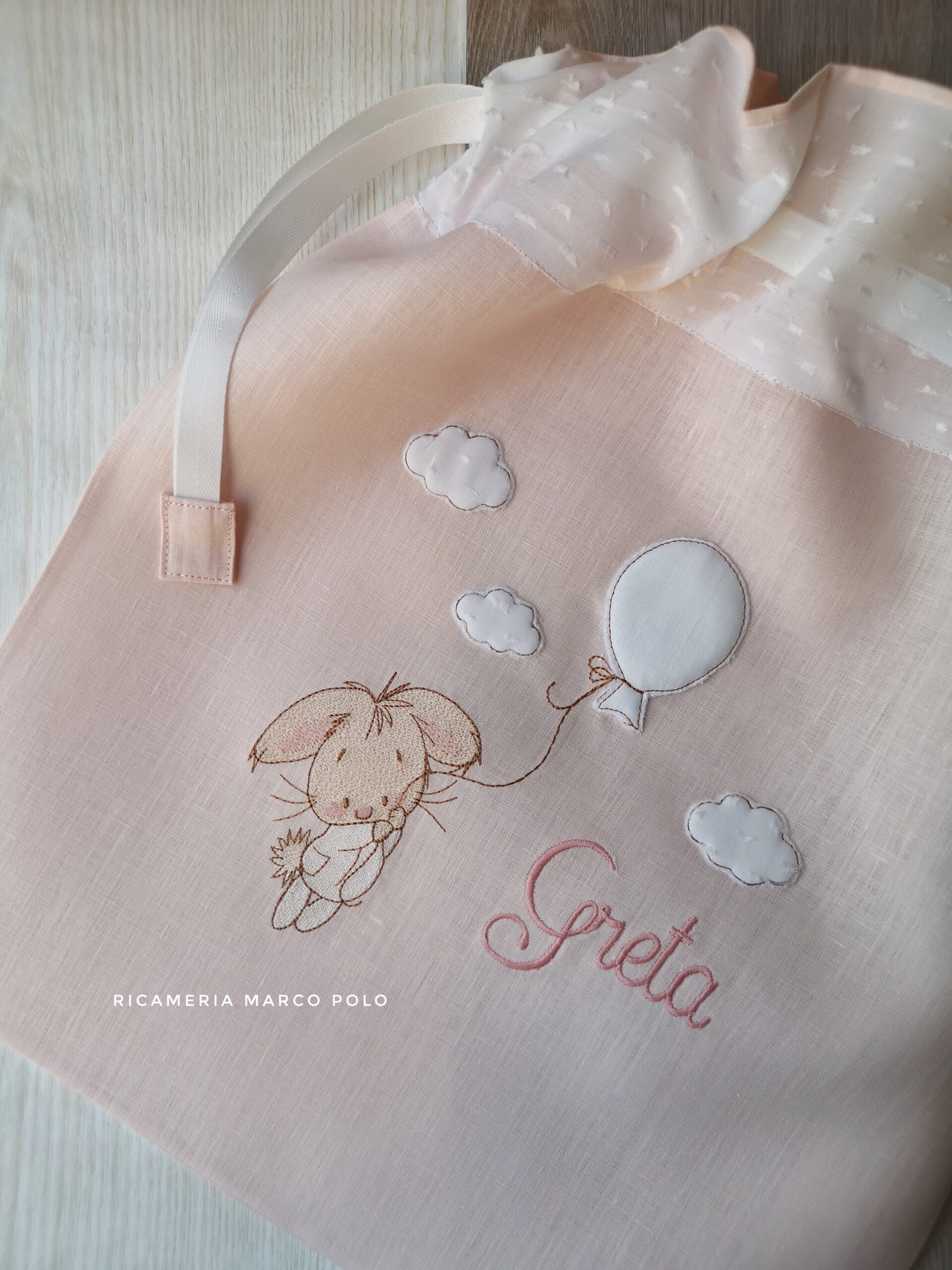 Sacca Primo cambio in purissimo lino cipria, con ricamo di un coniglietto appeso ad una stellina, e qualche nuvoletta.