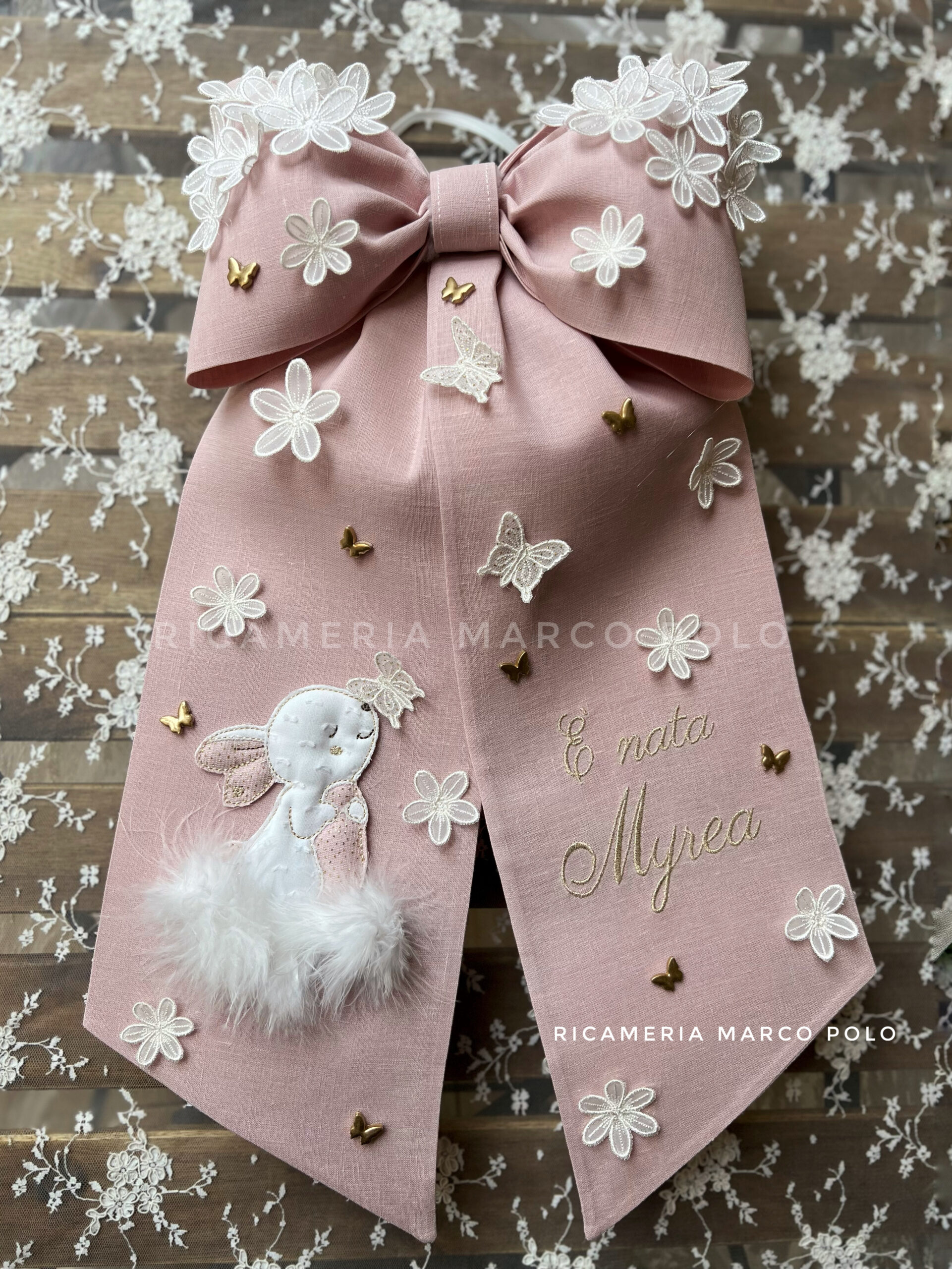 Fiocco di nascita in puro lino rosa antico. Sulla sinistra un dolce coniglietto con una farfalla sul nasino, fiori ricamati sia sulla parte superiore che sparsi lungo le code del fiocco. Farfalle ricamate panna e farfalle in ceramica oro per un tocco di luce. Ricamo del nome in oro.