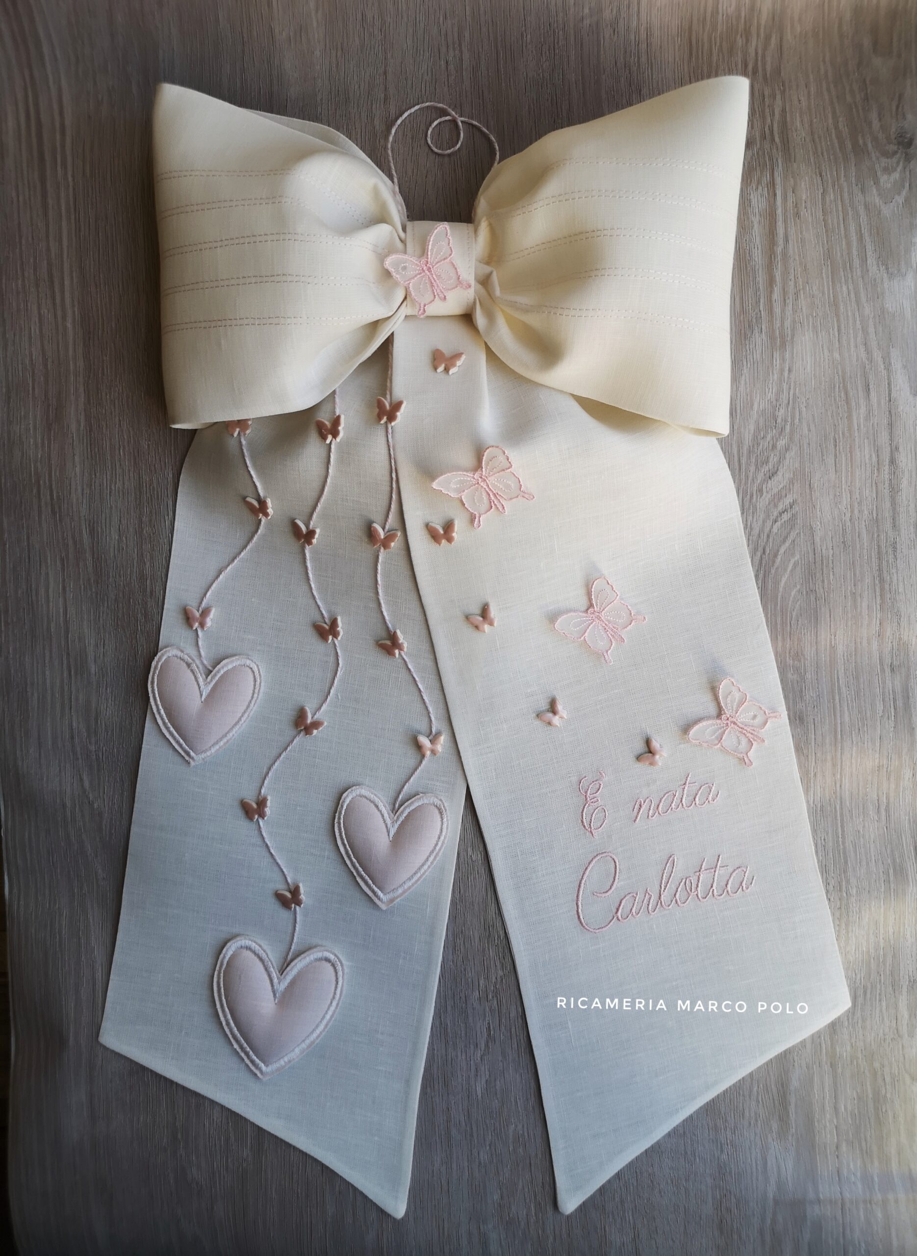 Fiocco di nascita di lino rosa cipria. Protagonisti sono tre cuori rosa che scendono sulla sinistra con tante piccole farfalle in ceramica sul cordoncino. Sulla destra tante farfalle rosa ricamate e in ceramica che giocano libere. Cuciture sulla parte superiore.