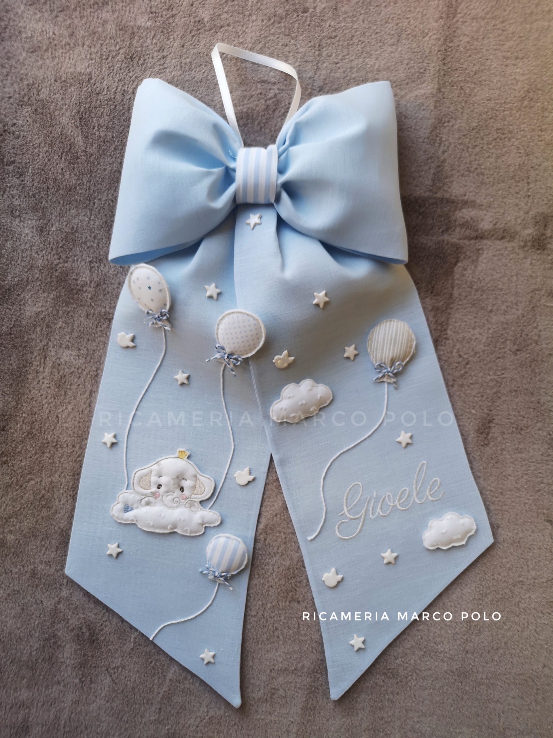 Fiocco nascita lino celeste con un elefantino che si affaccia da una nuvola, sorretta da due palloncini. Altri palloncini, uccellini e stelline completano il fiocco.
