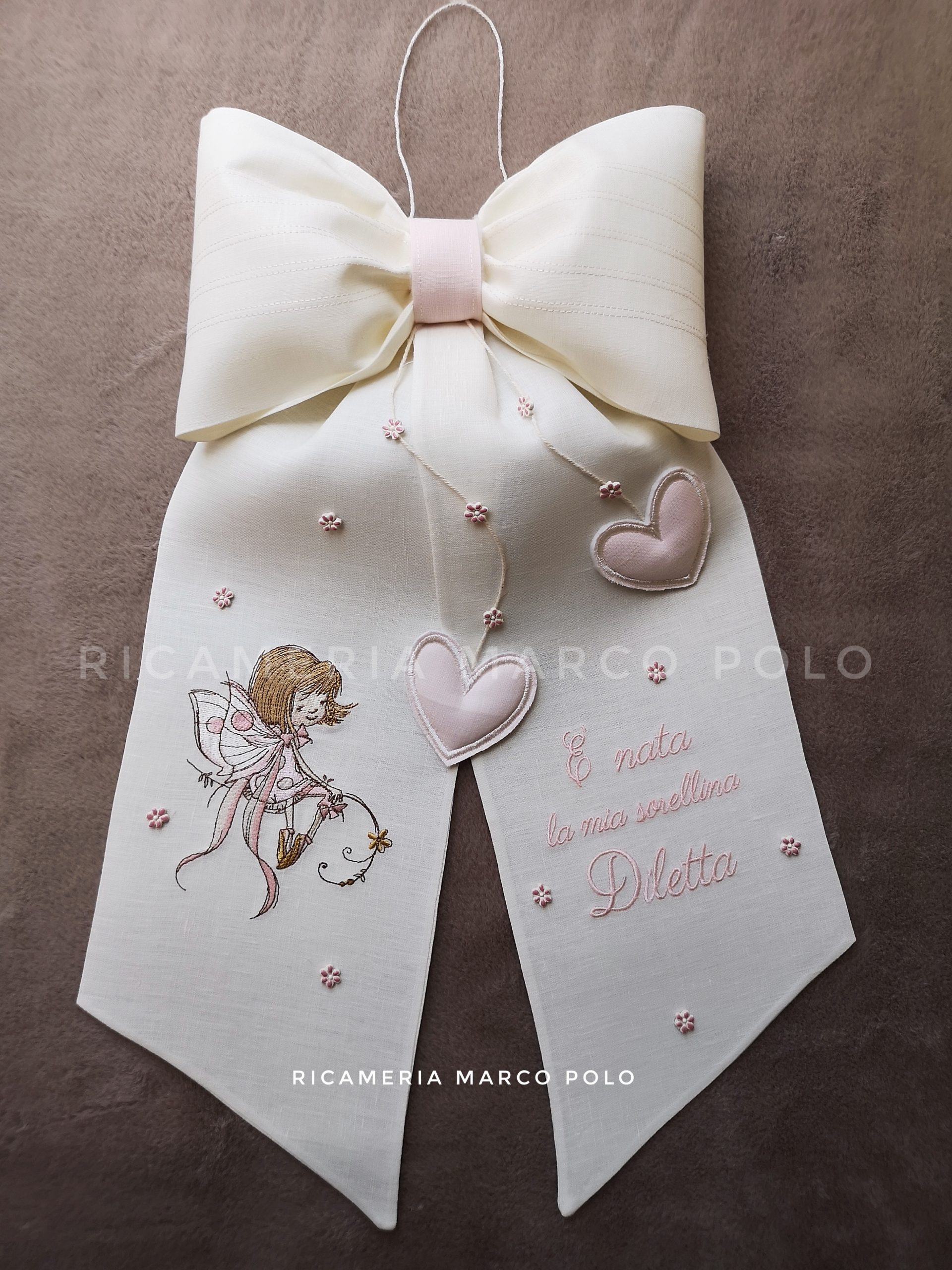 Fiocco di nascita lino panna con il ricamo di una fatina dei fiori sulla sinistra, due cuori rosa cipria che scendono a destra e tanti fiori in ceramica. Cuciture sulla parte superiore