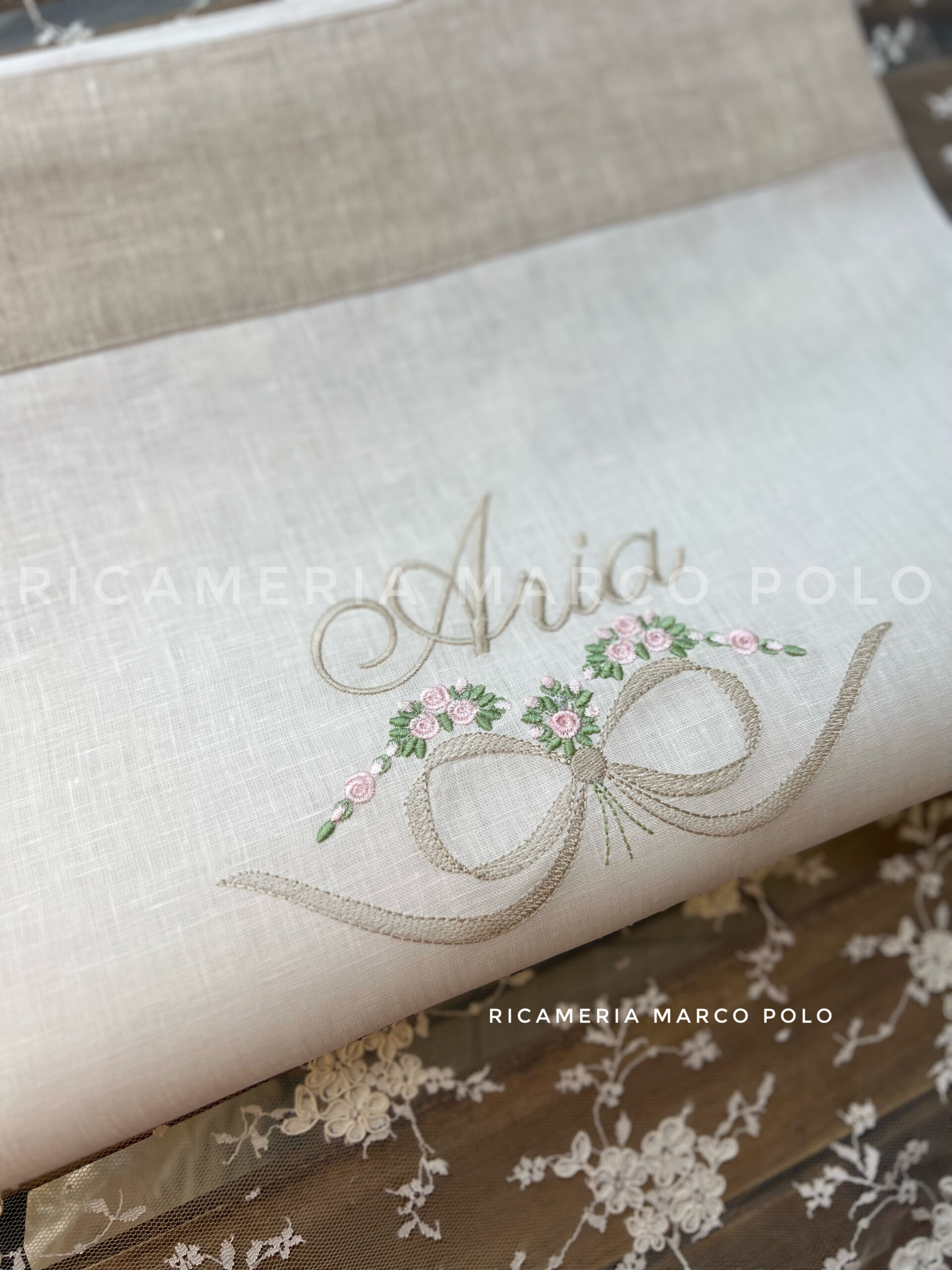 delicata sacca vestitini in lino panna con ricamo di un fiocco tortora e delicati fiori rosa chiaro. La sacca è adatta ad essere utilizzata per l’ospedale o la clinica per il primo cambio, oppure successivamente per l’asilo