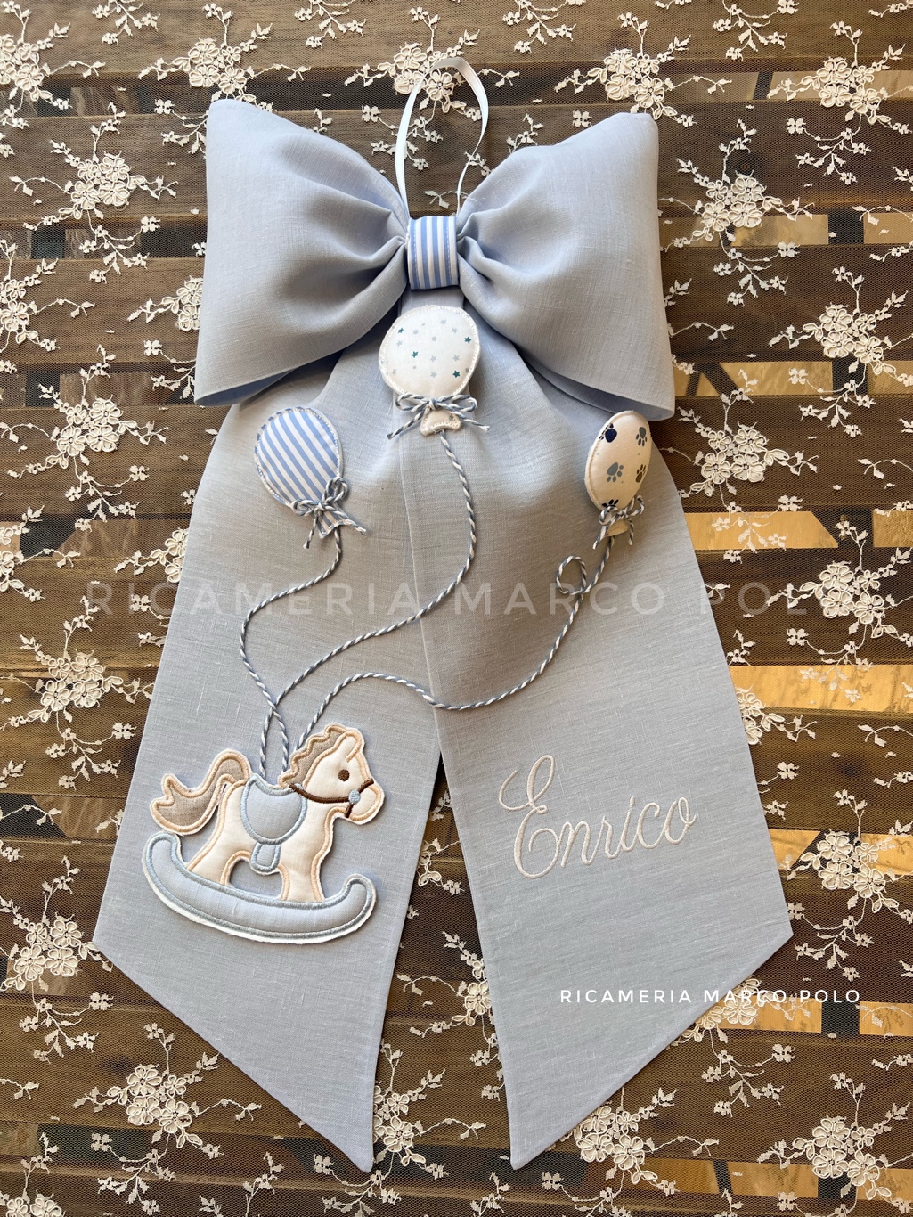 Fiocco nascita in purissimo lino colore celeste. Il cavallo a dondolo è uno di quei giochi che più rappresenta la presenza di una tenera creatura in una casa. In questo fiocco abbiamo inserito un cavallo a dondolo azzurro e tre palloncini a fantasia