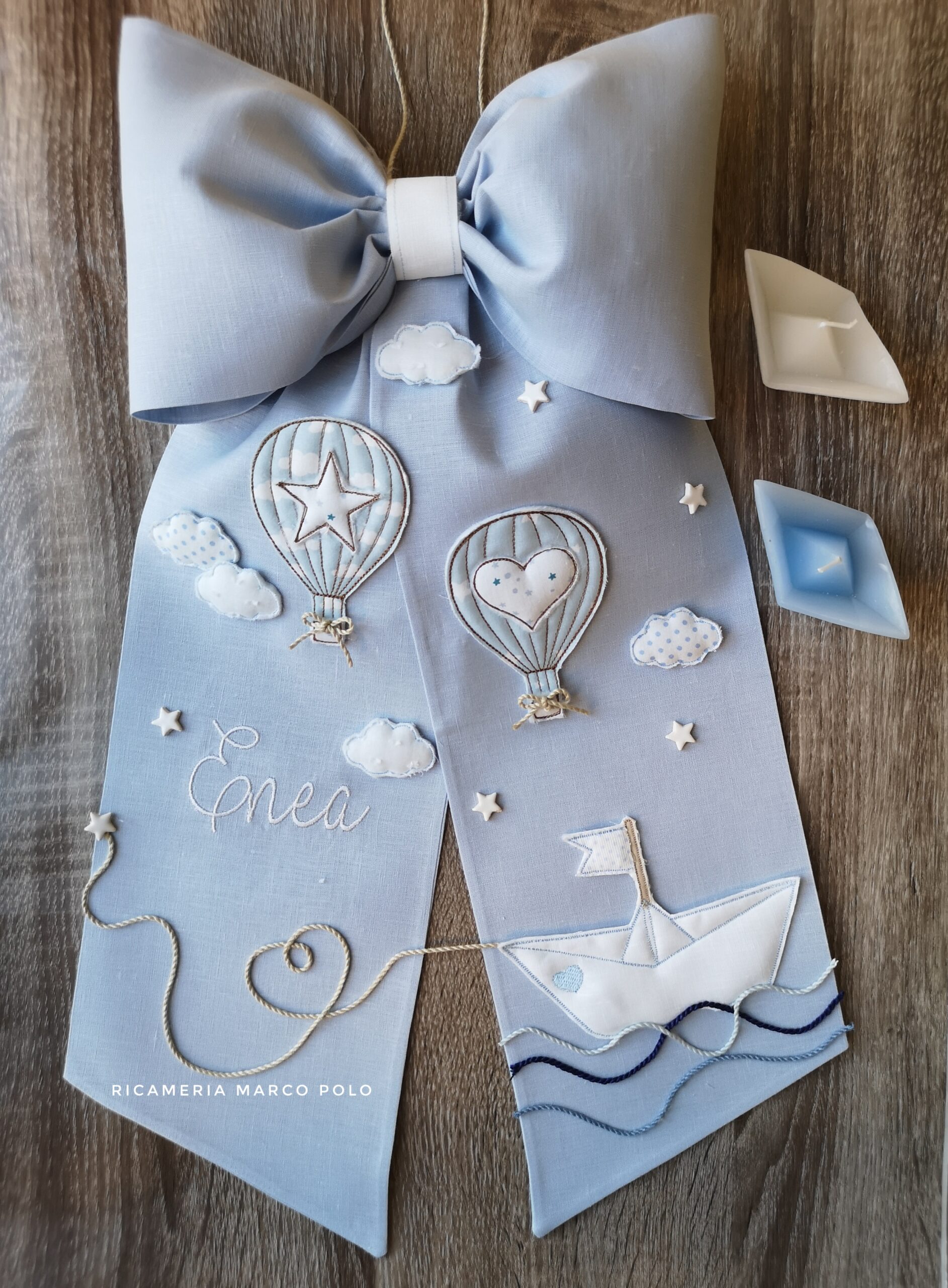 Questo elegante fiocco nascita in lino azzurro, è stato ideato per accogliere la nuova vita con un design marinaro raffinato e sognante. Realizzato in un bellissimo tessuto in colore azzurro si adatta perfettamente alla stanza del piccolo in arrivo. Una delicata barchetta in stile origami naviga dolcemente tra onde accompagnata da vivaci pesciolini nelle sfumature dell’azzurro e del blu. Piccole stelle, morbide nuvolette e due mongolfiere arricchiscono e completano il tutto insieme al nome ricamato.