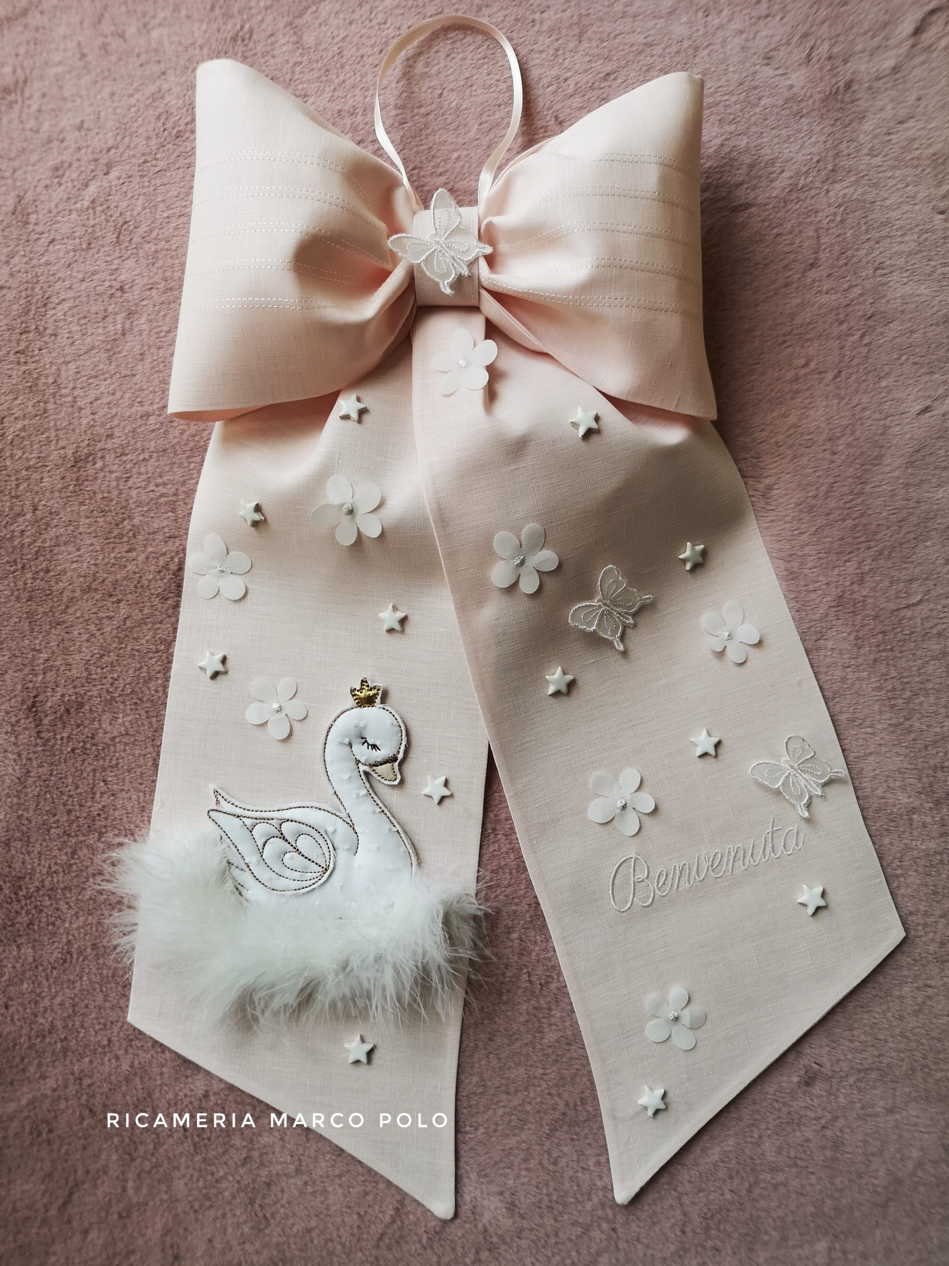 Cigno petali e cuciture. Fiocco Nascita lino cipria