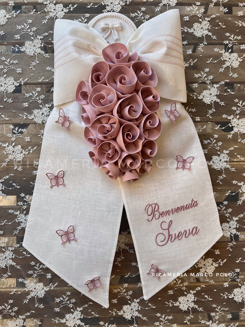 Fiocco di nascita in lino panna e generosa cascata di rose di lino rosa antico. Farfalline ricamate rosa antico. Colore del ricamo del nome in rosa antico