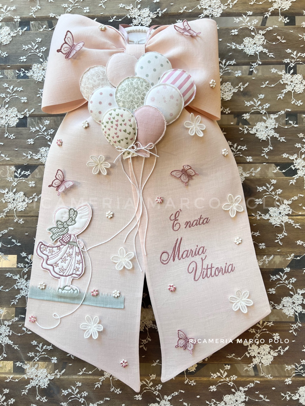Fiocco di nascita in puro lino rosa cipria. La protagonista è una bimba con un vestitino che ricorda tempi passati, un prato fiorito, la leggera brezza primaverile che ti scompiglia i capelli e ti muove la gonna leggera. Questa bimba è andata a giocare con i suoi palloncini in mezzo a petali di fiori e farfalline che libere volano nel cielo.