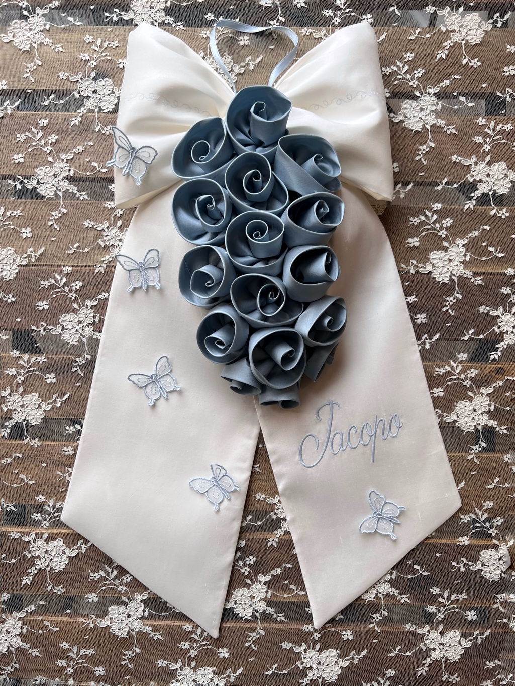 Il Fiocco nascita seta panna con cascata di rose azzurro polvere è un elegante annuncio di nascita pensato per celebrare un momento indimenticabile. Queste creazione rappresenta la quintessenza dell’eleganza. Il protagonista assoluto è la seta, l’intero fiocco è realizzato in shantung di seta,  una generosa cascata di rose in seta color azzurro polvere, impreziosita da delicate farfalline ricamate azzurro polvere. Anche il nome è ricamato in azzurro polvere  in perfetta armonia con l’intera composizione.