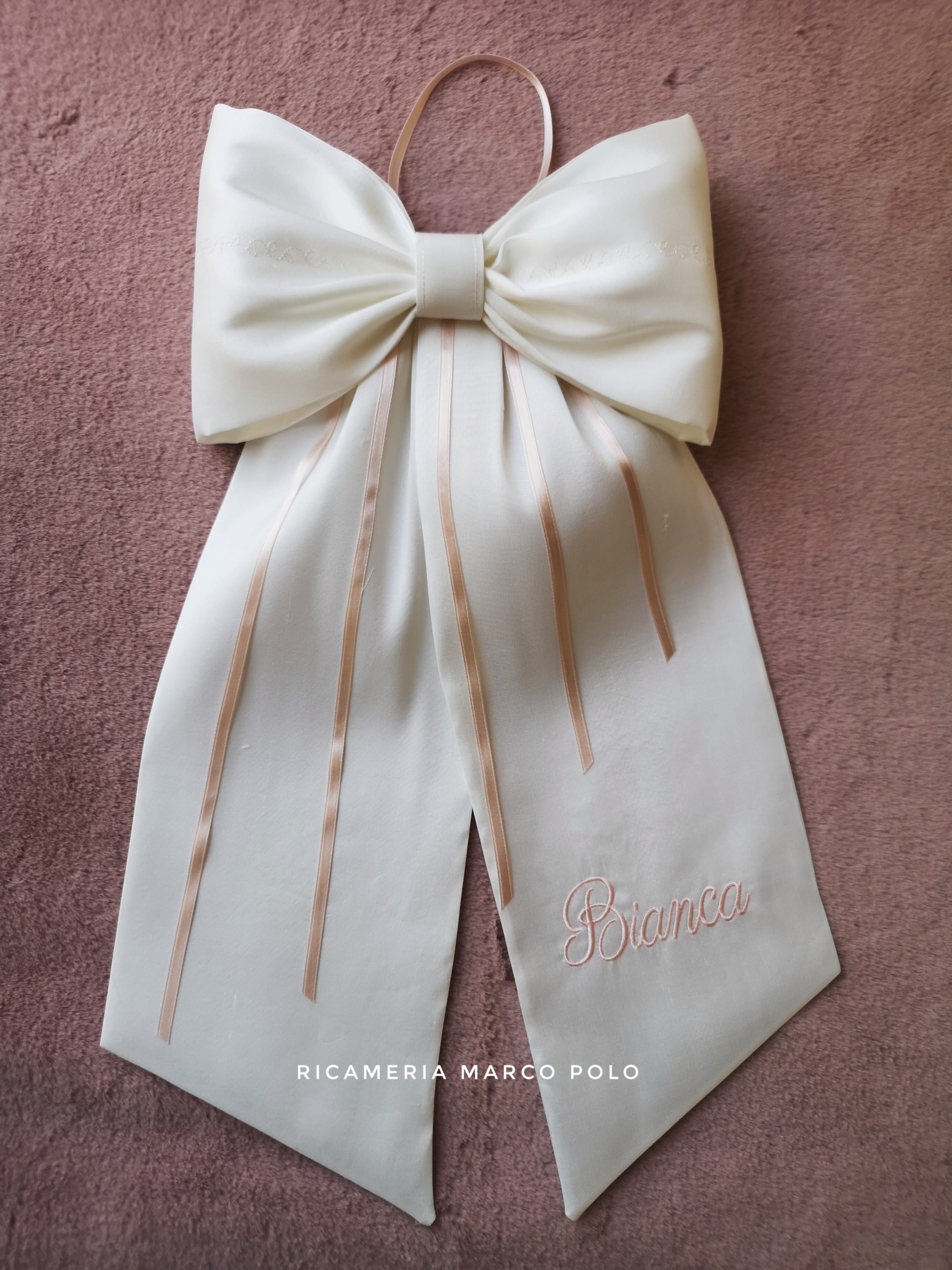 Fiocco di nascita in shantung di pura seta di colore panna, con dettaglio nastri in varie altezze e ricamo del nome in cipria.