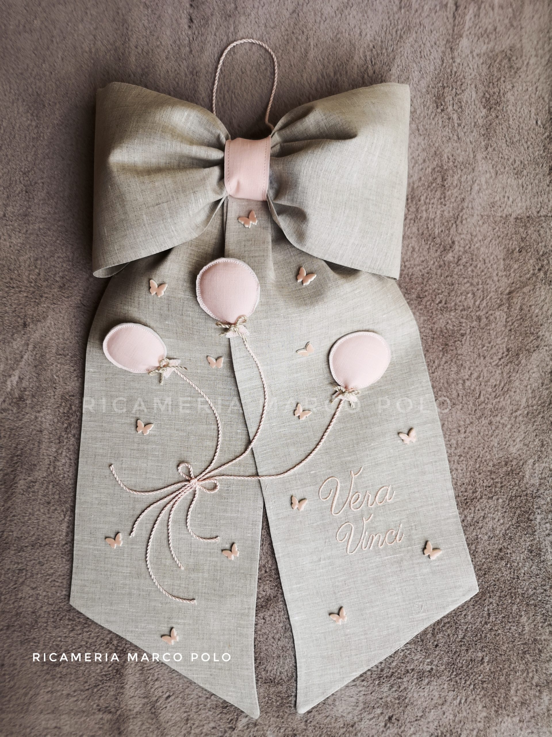 Un fiocco nascita semplicissimo, dove è protagonista solo il lino tortora e 3 palloncini rosa che insieme alle farfalline sparse danno semplicemente un tocco di colore