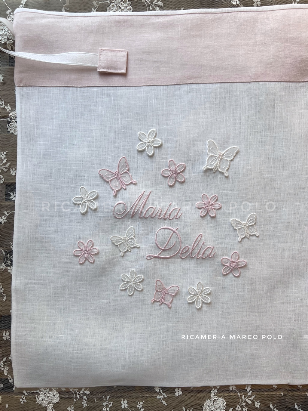 Sacca primo cambio in lino panna con fascia superiore lino rosa cipria. Sulla sacca il ricamo del nome e tutti intorno cuciti fiori e farfalle realizzate da noi.