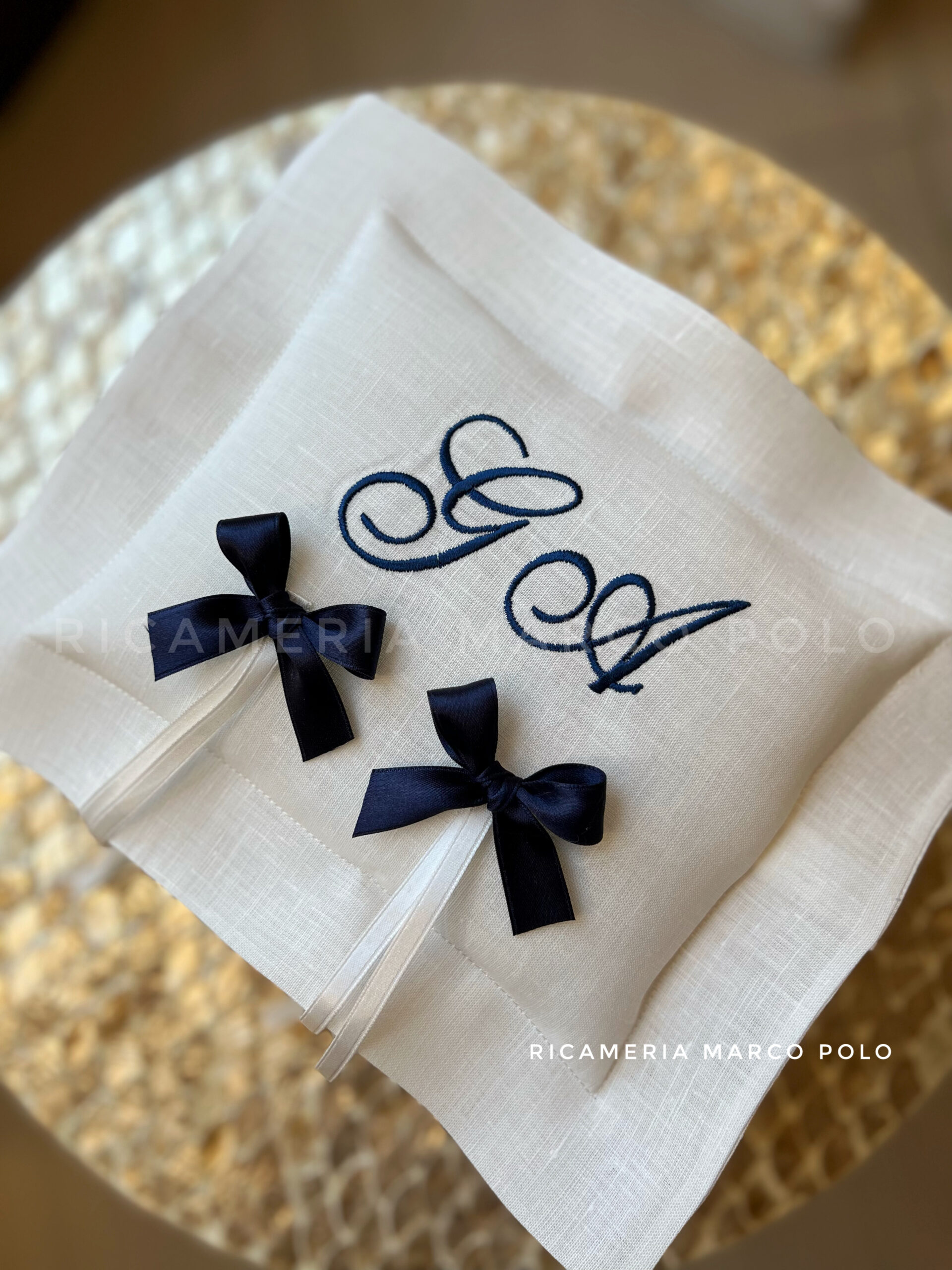 Portafedi in purissimo lino di forma rettangolare personalizzato con iniziali blu ricamate. Doppio fiocchetto in raso italiano blu 16 mm, e panna 6mm.