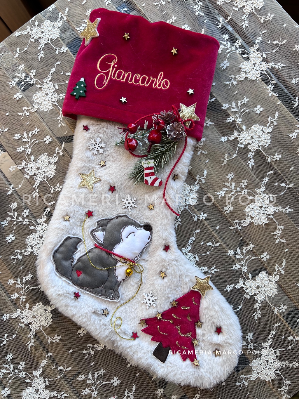 Calza Natalizia  o della Befana? A te stabilirne l’uso, per noi vanno bene per ambedue le feste, cambia solo il contenuto che vuoi mettere dentro. La calza in foto è realizzata in peluche panna e fascia in velluto rosso. Il protagonista è un lupetto  in una pineta, che ulula alla notte e alle stelle nel cielo. Stelle e rametti completano tutto