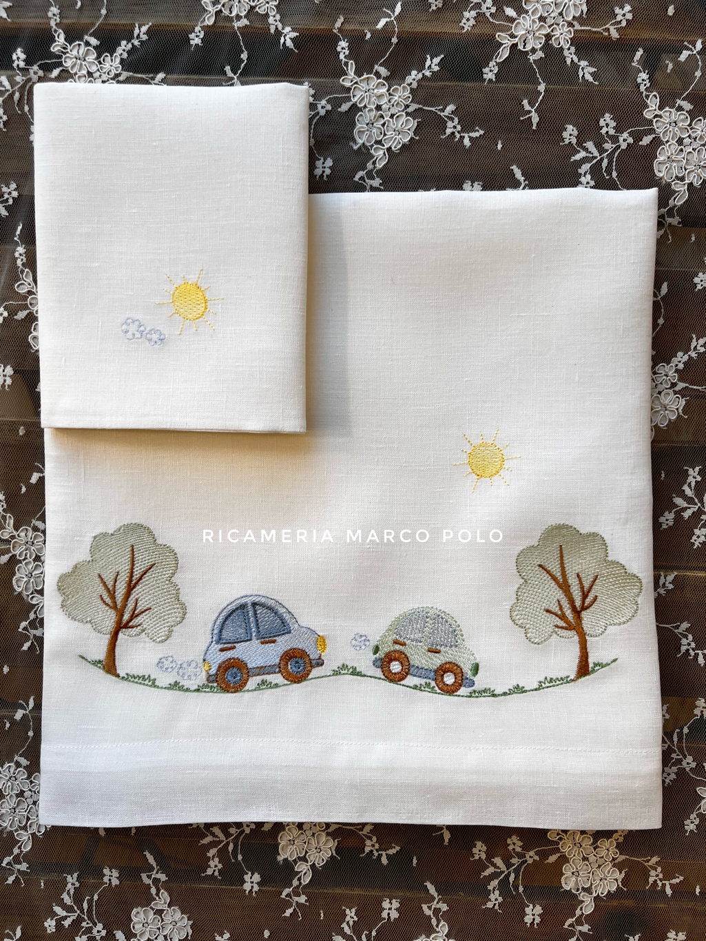 Questo raffinato set lenzuolino in puro lino è pensato per chi cerca l’eleganza senza tempo unita a un pizzico di allegria. Il protagonista di questo lenzuolino è un delicato ricamo che ritrae un piccolo paesaggio incantato: due macchinine che viaggiano tra prati e alberi stilizzati, sotto un sole splendente. Osservando il ricamo ti sembra quasi di essere li a guardare le macchinine colorate passare sulla strada, senti il rumore del motore, il vento che passa tra i rami, il calore del sole…una piccola poesia bucolica! Un lenzuolino che si presta ad essere un regalo molto gradito o semplicemente utilizzato per il corredino.