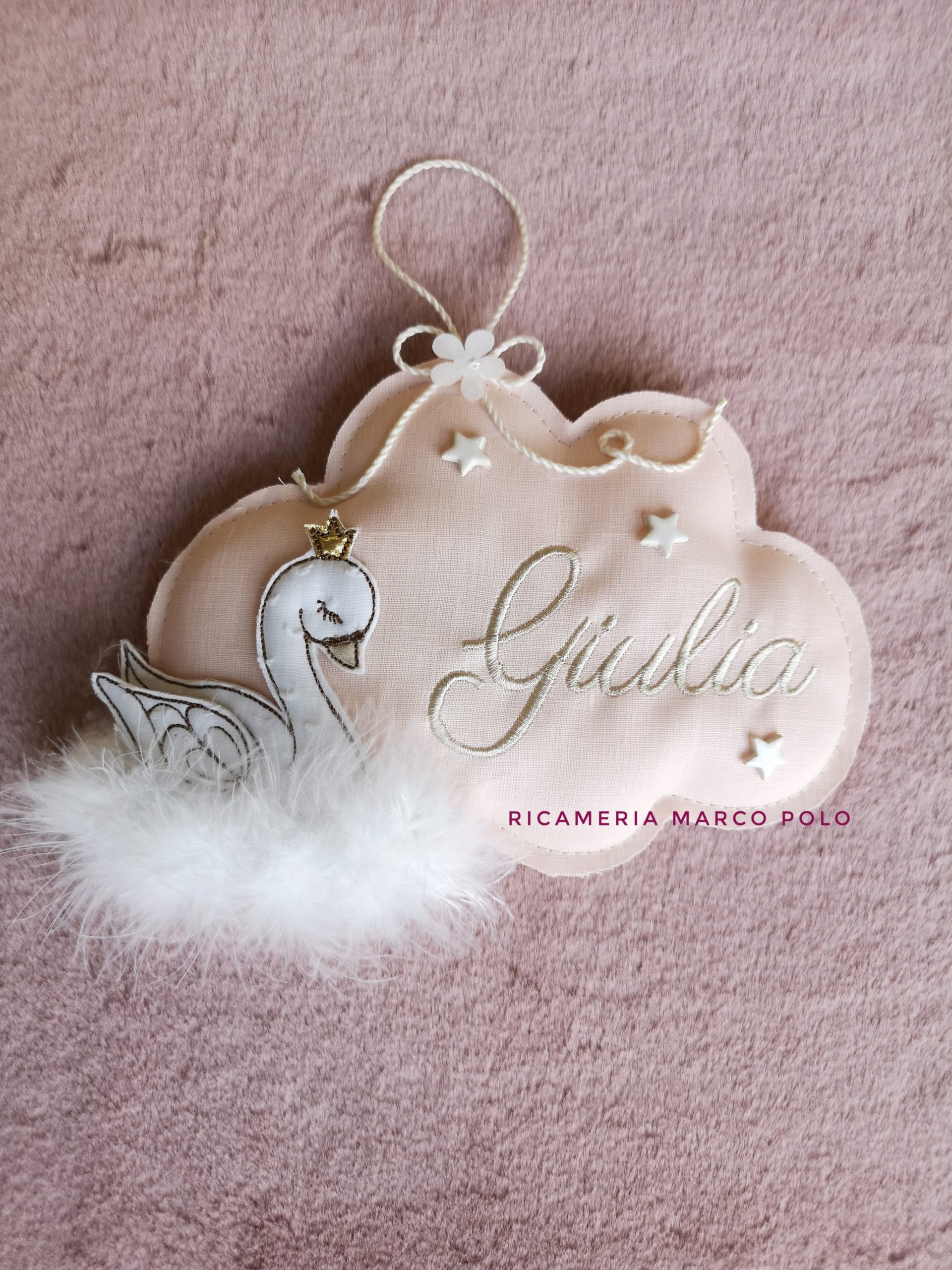 Fiocco culla realizzato nella forma di nuvoletta, dalle dimensioni contenute volutamente per non essere invadente. Un cigno e qualche stellina sono i decori di questa nostra proposta per la culletta dei vostri bimbi.