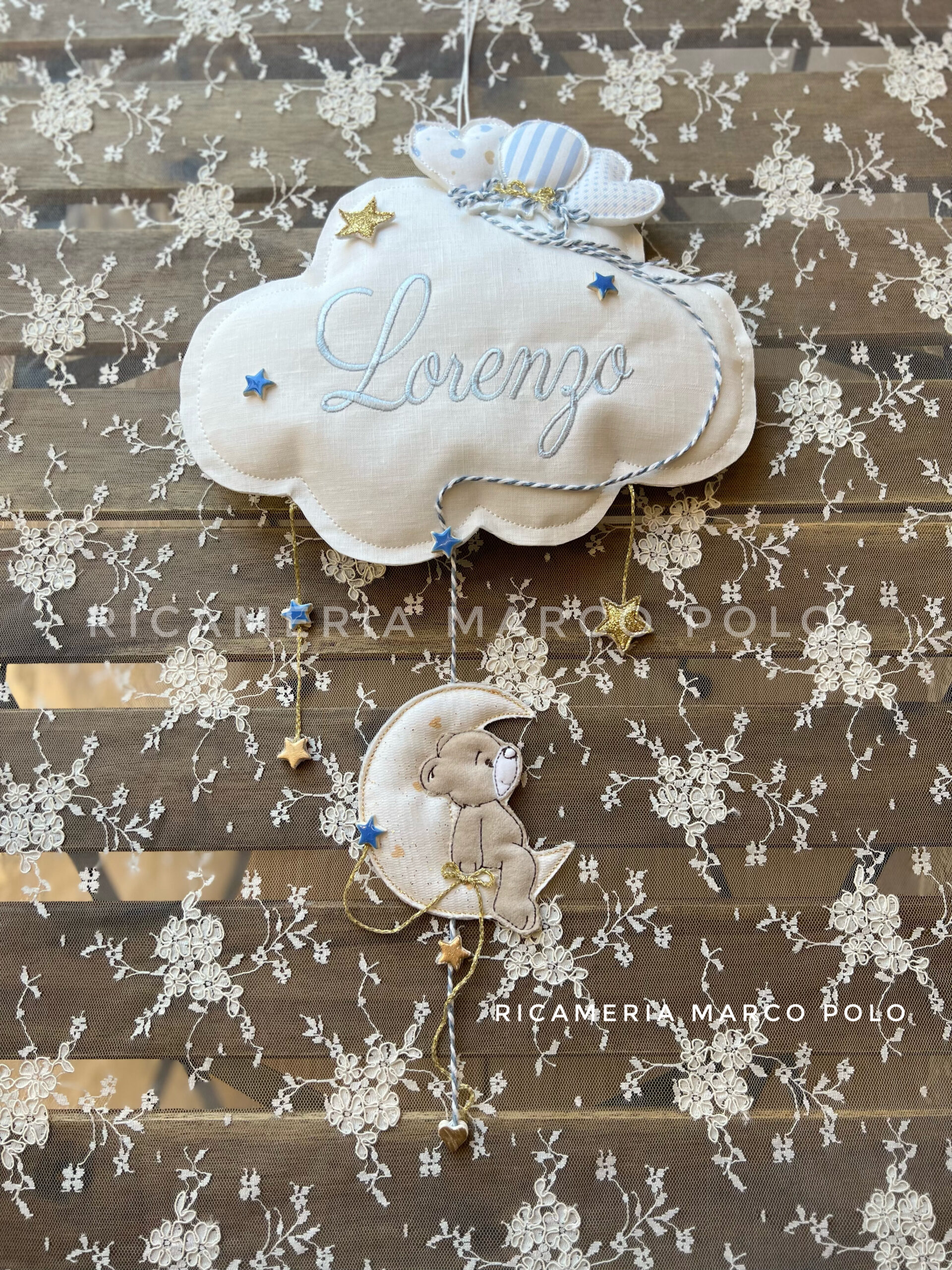 Fiocco nascita alternativo a forma di nuvoletta, con 3 palloncini, un orsetto che si lascia cullare da una luna. Si evidenzia che i palloncini potrebbero essere diversi dalla foto, in quanto i tessuti non sempre sono disponibili. Verranno comunque utilizzati dei colori similari e armoniosi con il contesto del fiocco di nascita stesso.