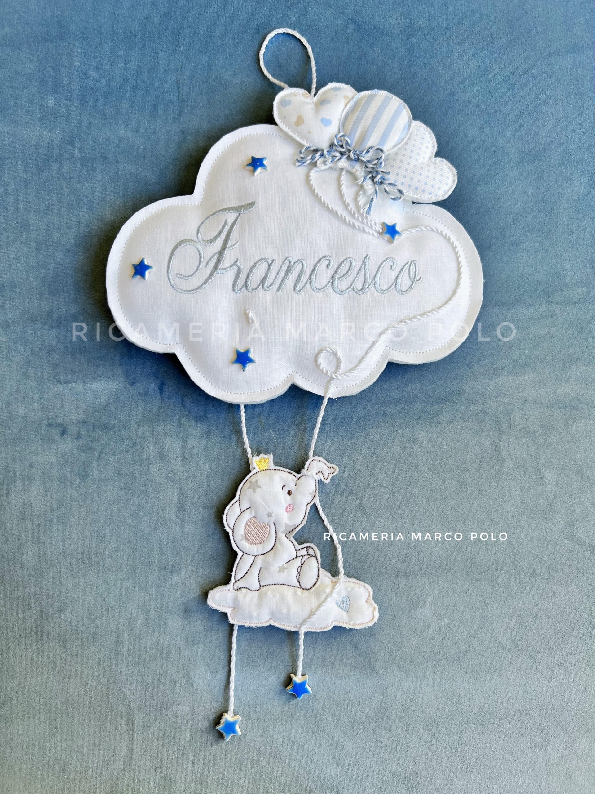 Nuvoletta in lino panna con elefantino che tiene 3 palloncini colorati. Colore del ricamo e delle stelline sparse in ceramica di colore azzurro. Questa nuvoletta si presta ad essere appesa alla culletta o per chi ha esigenze di spazio più piccole rispetto ad un fiocco di nascita tradizionale.