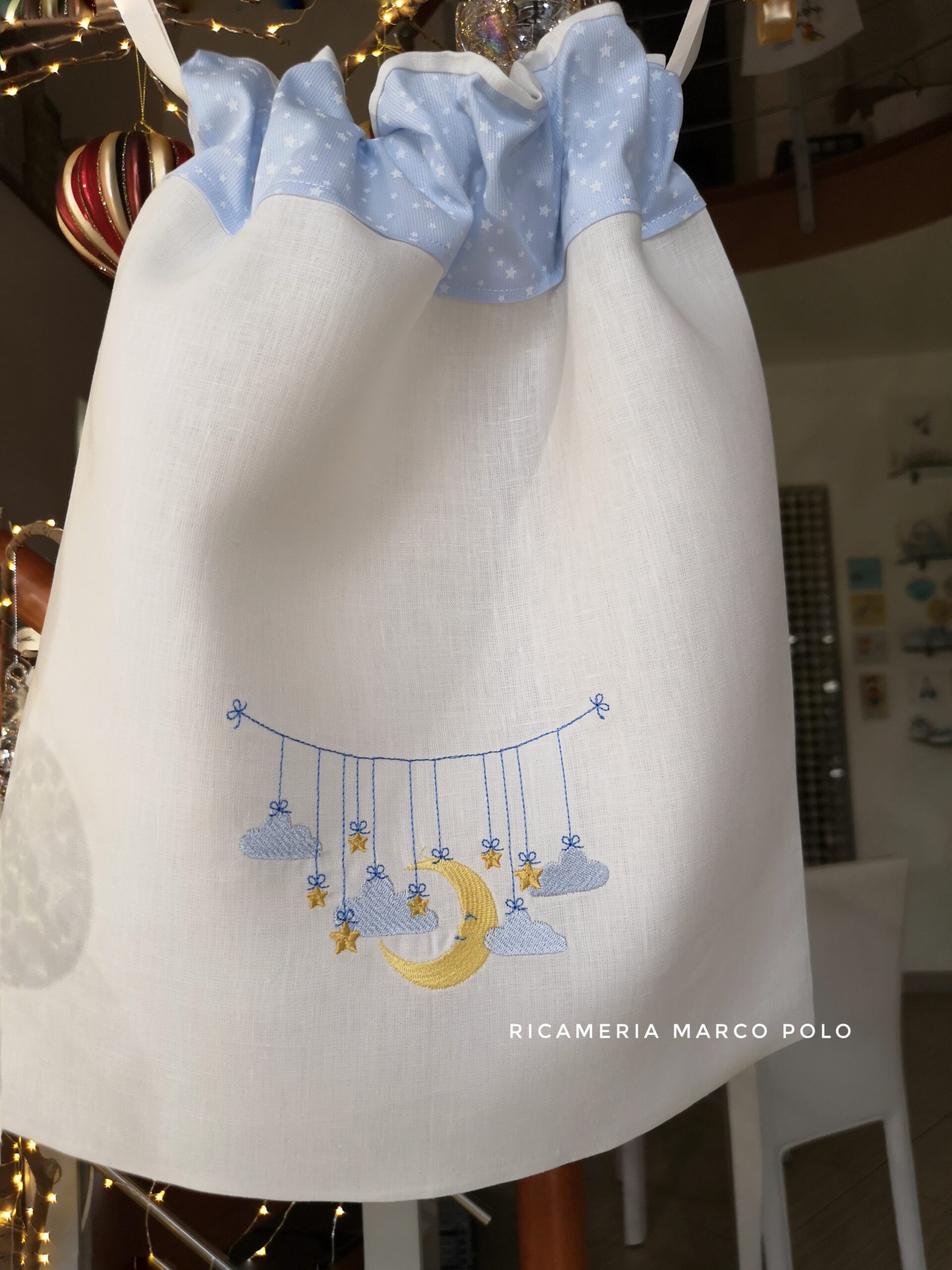 Sacca primo cambio lino panna con il ricamo di un filo a cui sono appese delle nuvolette e delle stelline e una nuvola centrale.