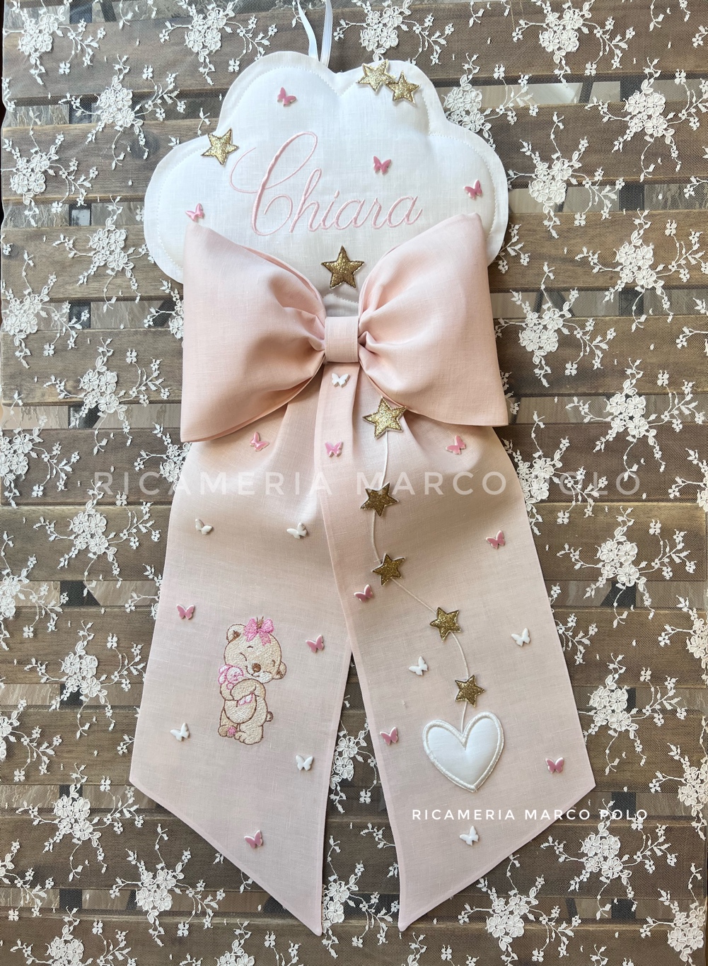 Fiocco nascita lino rosa cipria attaccato ad una grande nuvola. un orsetta che tiene un coniglietto tra le zampe, circondate da cuori stelle e farfalle.