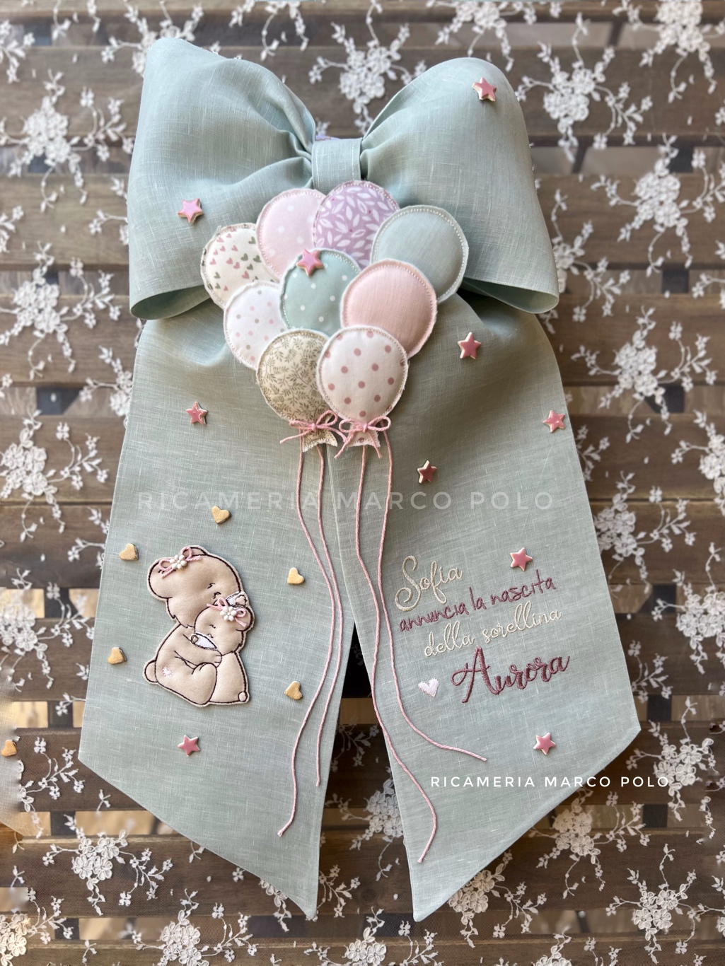 Si precisa che il fiocco verrà realizzato SOLO con il nome indicato nell’ordine. Le eventuali frasi aggiuntive visibili nelle foto sul sito, sono disponibili su richiesta: alcune gratuite, altre personalizzabili con un piccolo contributo. Le fantasie di eventuali palloncini presenti sul fiocco, possono differire rispetto la foto e verranno sostituite con altre fantasie a seconda disponibilità e nel pieno rispetto dell’armonia del fiocco stesso.
