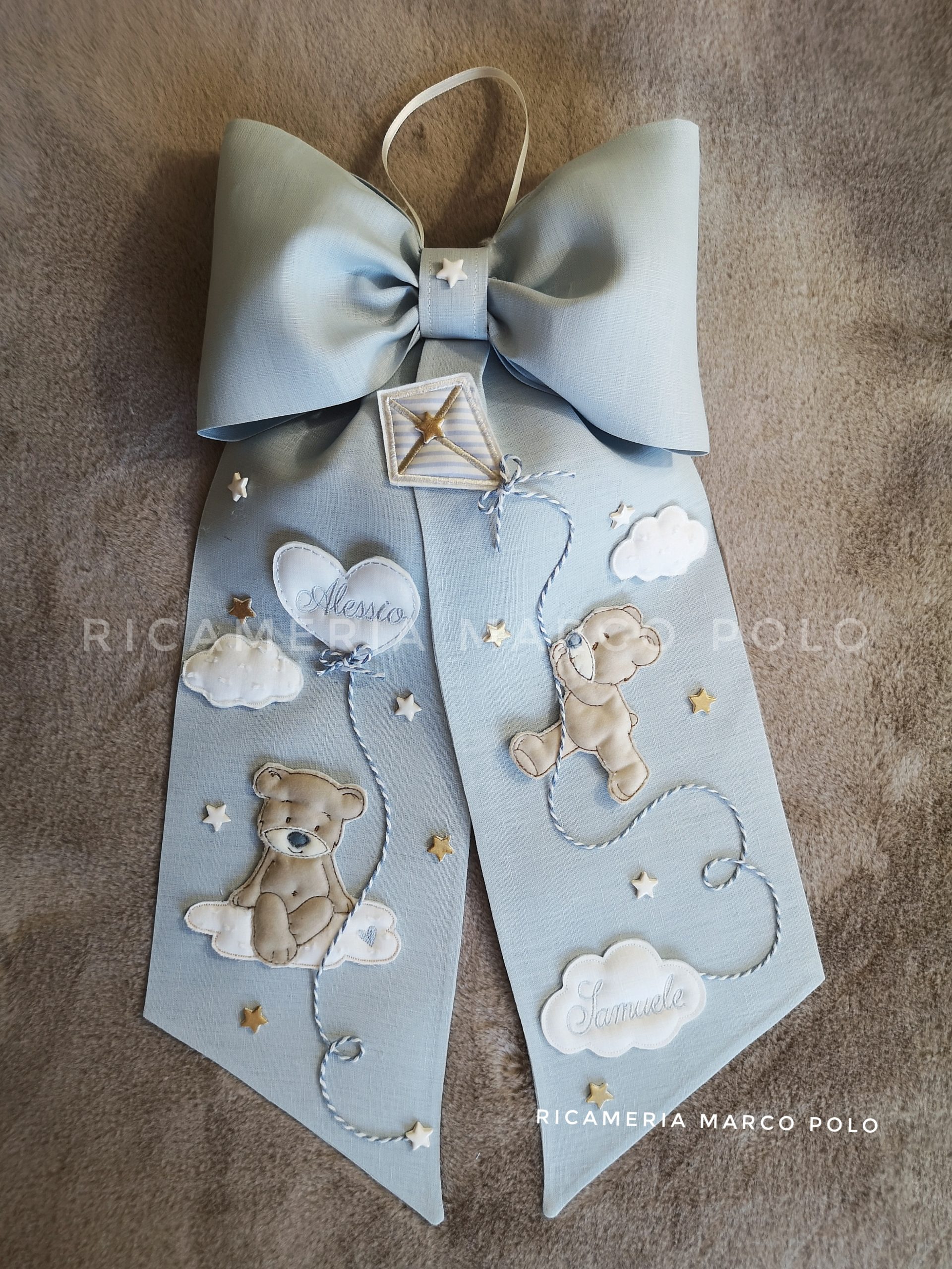 Fiocco nascita lino celeste, adatto a due gemelli. qui abbiamo due orsetti, uno seduto su una nuvola, l’altro appeso ad un aquilone. I nomi sono ricamati sul palloncino a cuore o sulla nuvola.