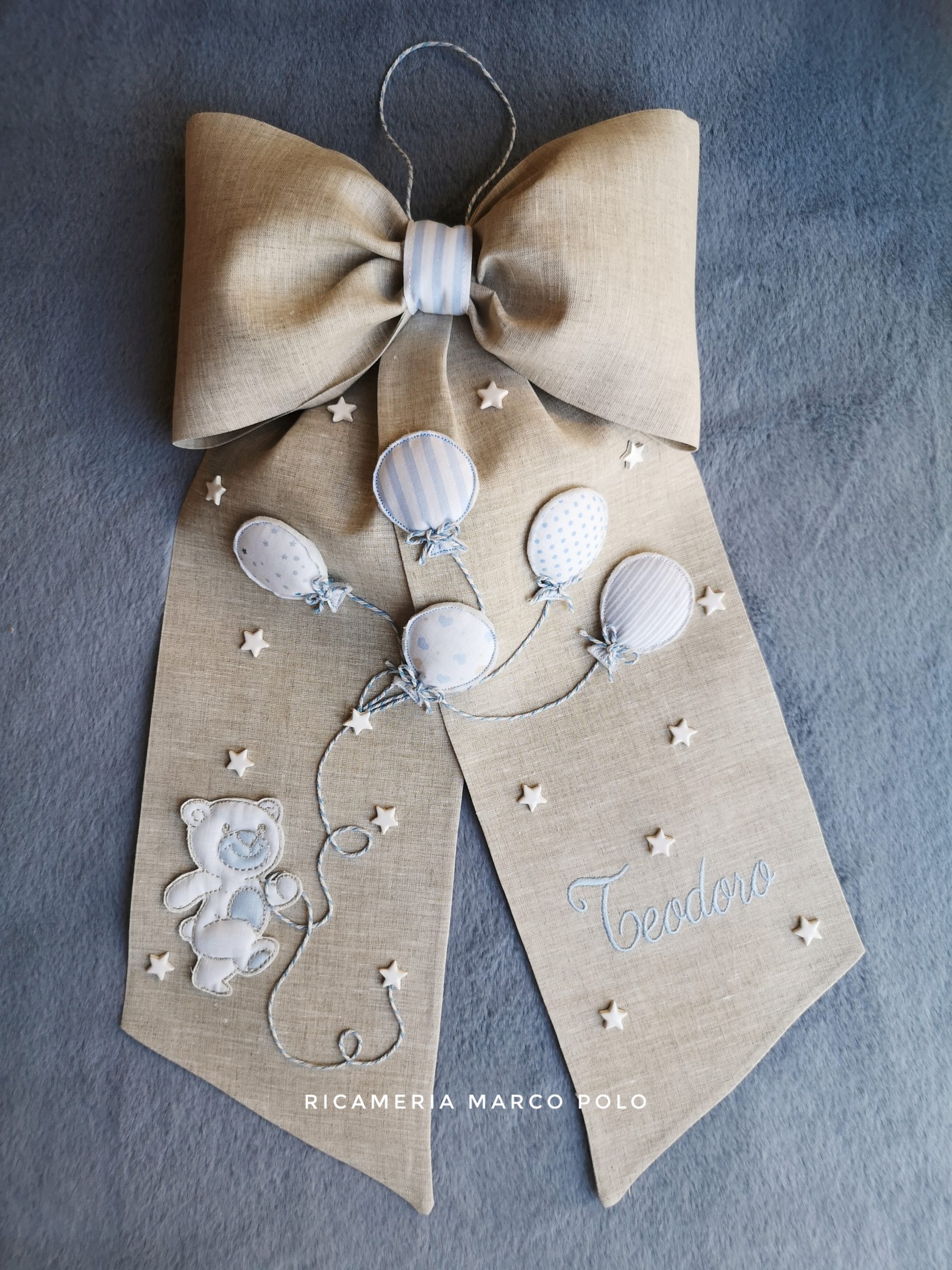 Fiocco nascita lino tortora con ricamo orsetto che tiene 5 palloncini  in varie fantasie e colori. A tale proposito si precisa che i palloncini potrebbero essere diversi dalla foto, in quanto i tessuti non sempre sono disponibili. Verranno comunque utilizzati dei colori simili e armoniosi con il contesto del fiocco.  Il ricamo del nome è in tortora, ma può essere sostituito con qualunque colore vogliate