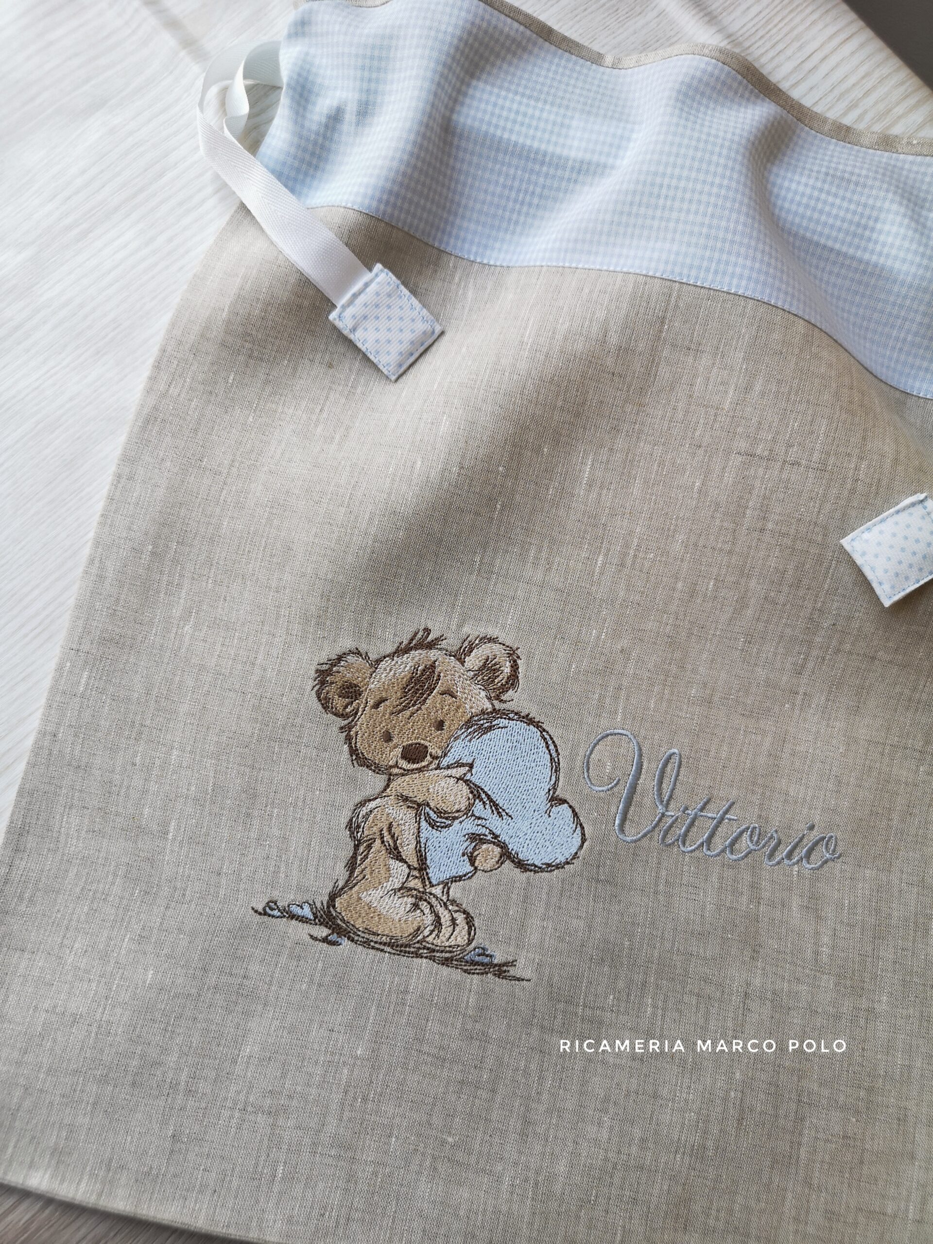 Sacca per il primo cambio il lino tortora e fascia superiore fantasia. Al centro il ricamo di un tenerissimo orsetto che tiene un cuscino azzurro a forma di cuore