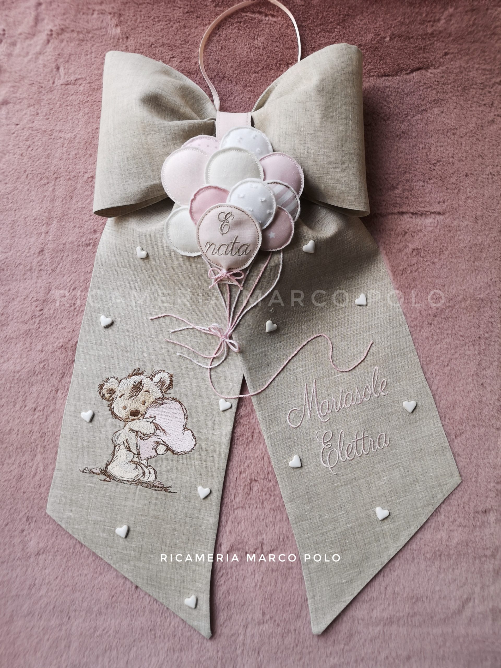 Fiocco nascita in purissimo lino tortora. Il ricamo di un tenero orsetto che tiene un cuscino a forma di cuore, un gruppo di palloncini che volano in alto. e in uno di questi palloncini la scritta “E’ nata”. Delicati cuoricini in ceramica panna completano tutto.