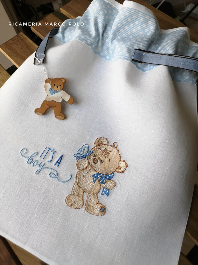 Sacca primo cambio in lino panna con fascia superiore a fantasia. Qui abbiamo un orsetto ricamato che tiene in mano una farfalla. colore celeste.