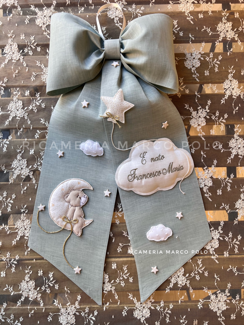 Fiocco nascita lino verde menta con orsetto seduto su una luna a sinistra che guarda una nuvola con il nome ricamato del bimbo in arrivo. un palloncino a forma di stella sulla destra vola in alto tra altre piccole nuvole e stelline.