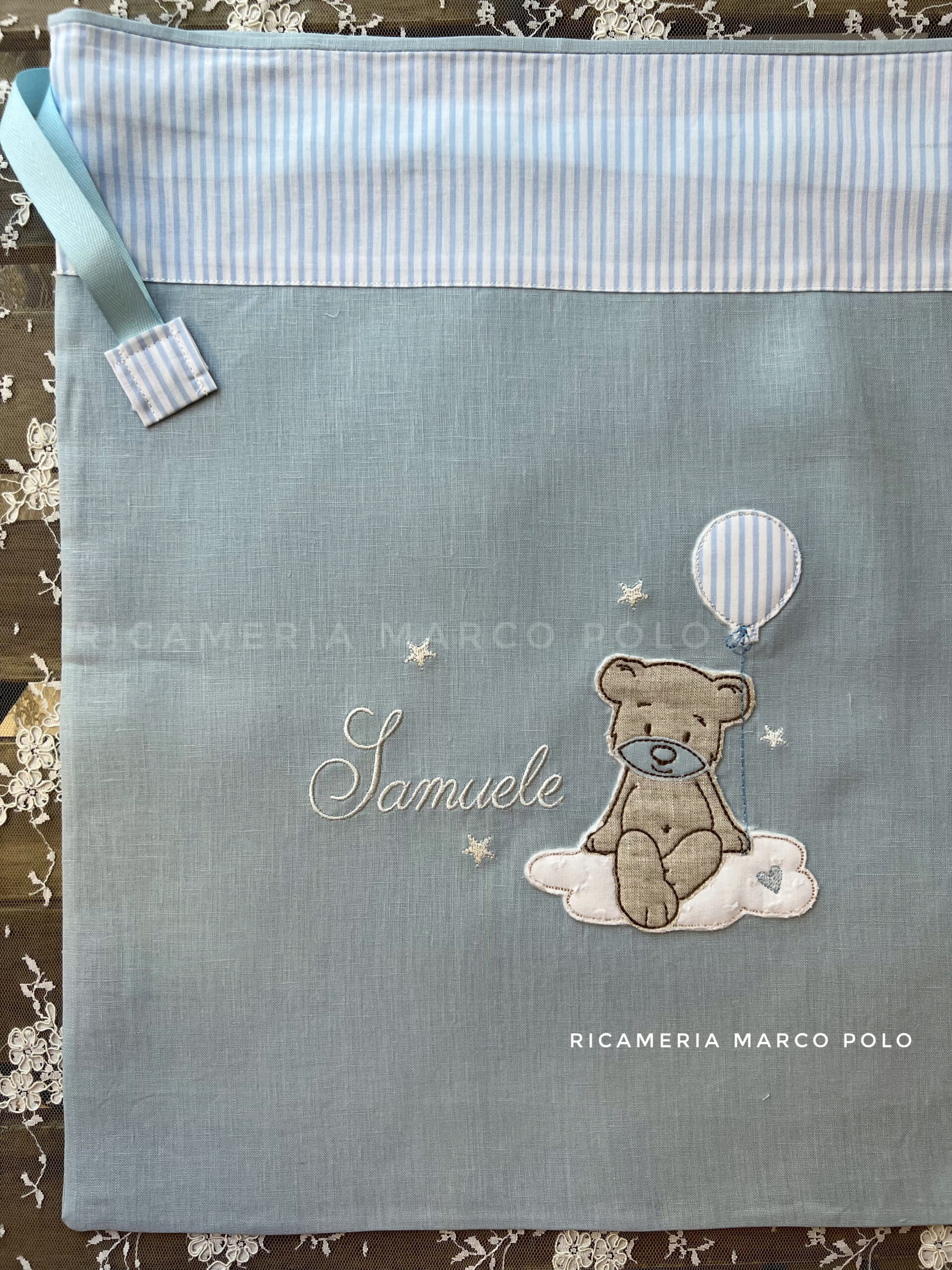 Orsetto su nuvola. Sacca cambio lino azzurro polvere