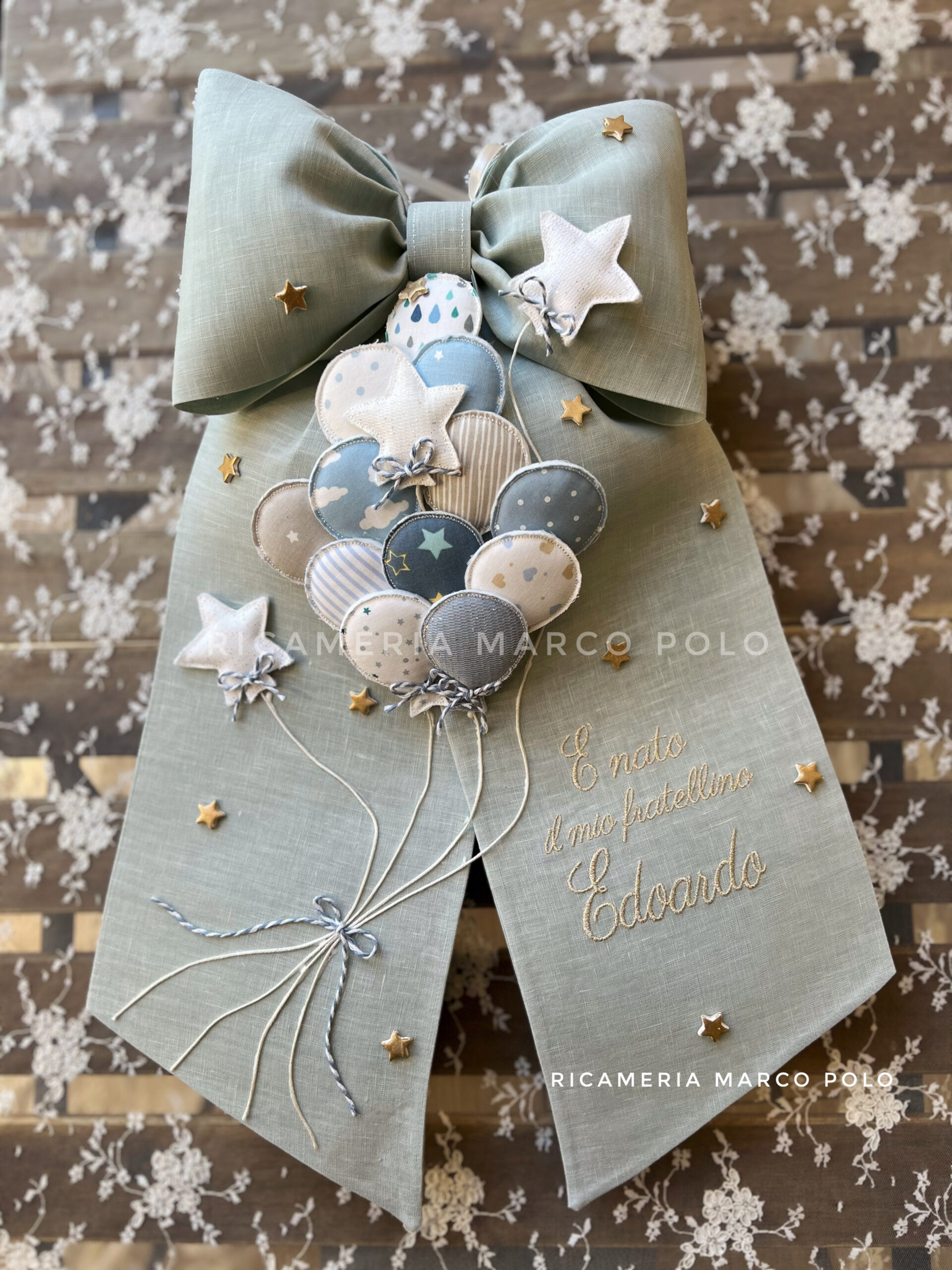 Palloncini azzurri e stelle in volo, un fiocco di nascita in lino verde menta, con ricamo e stelline in ceramica in oro: un fiocco di nascita fuori dagli schemi.