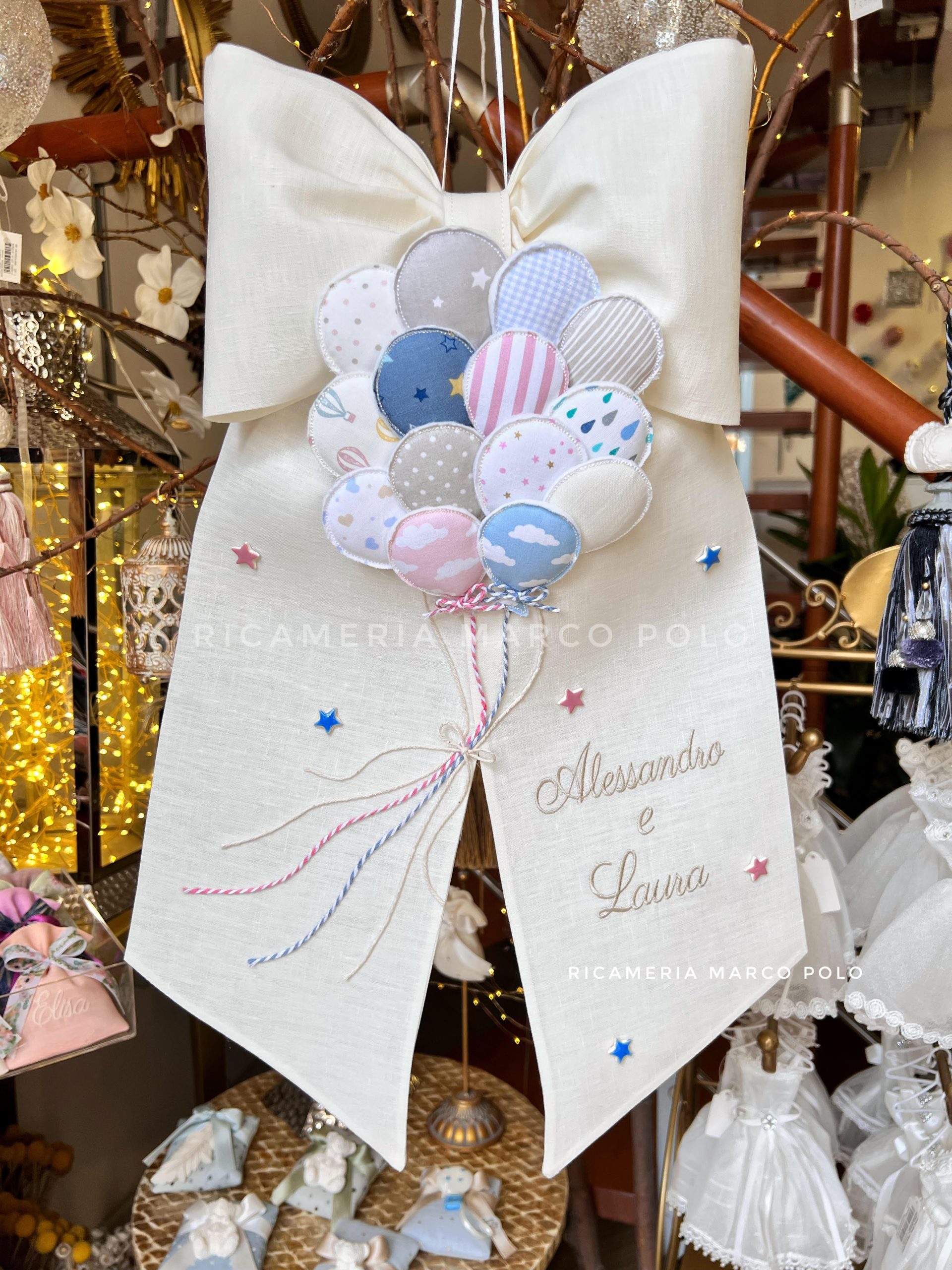 Si precisa che il fiocco verrà realizzato SOLO con il nome indicato nell’ordine. Le eventuali frasi aggiuntive visibili nelle foto sul sito, sono disponibili su richiesta: alcune gratuite, altre personalizzabili con un piccolo contributo. Le fantasie di eventuali palloncini presenti sul fiocco, possono differire rispetto la foto e verranno sostituite con altre fantasie a seconda disponibilità e nel pieno rispetto dell’armonia del fiocco stesso.