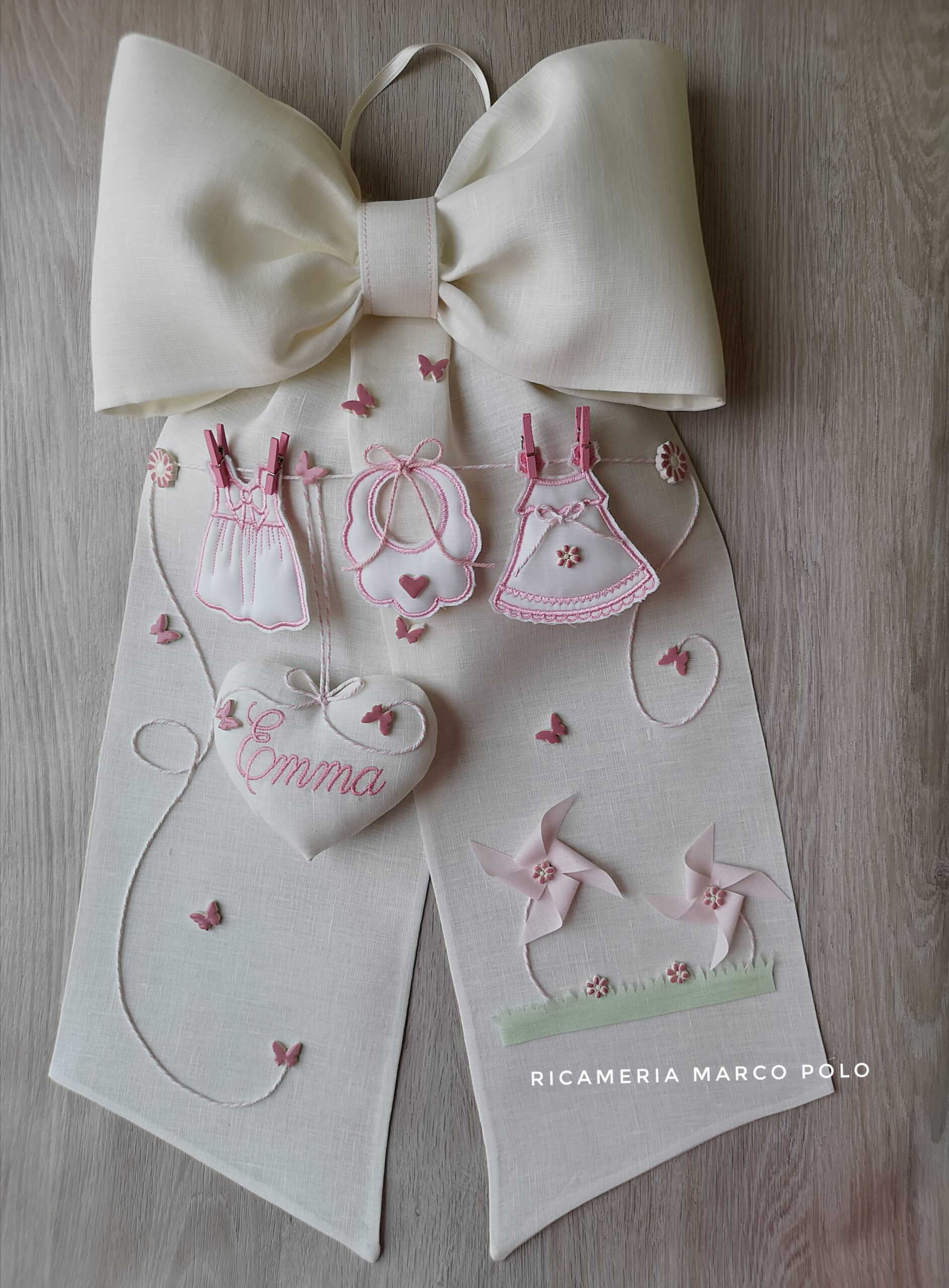 Fiocco nascita panna in lino . Qui il protagonista è un filo in cui è steso il bucato del nuovo bebè appena arrivato. due vestitini e una bavetta e poi un cuore con il nome. sulla destra un prato con tante girandole. Piccole farfalline completano tutto.