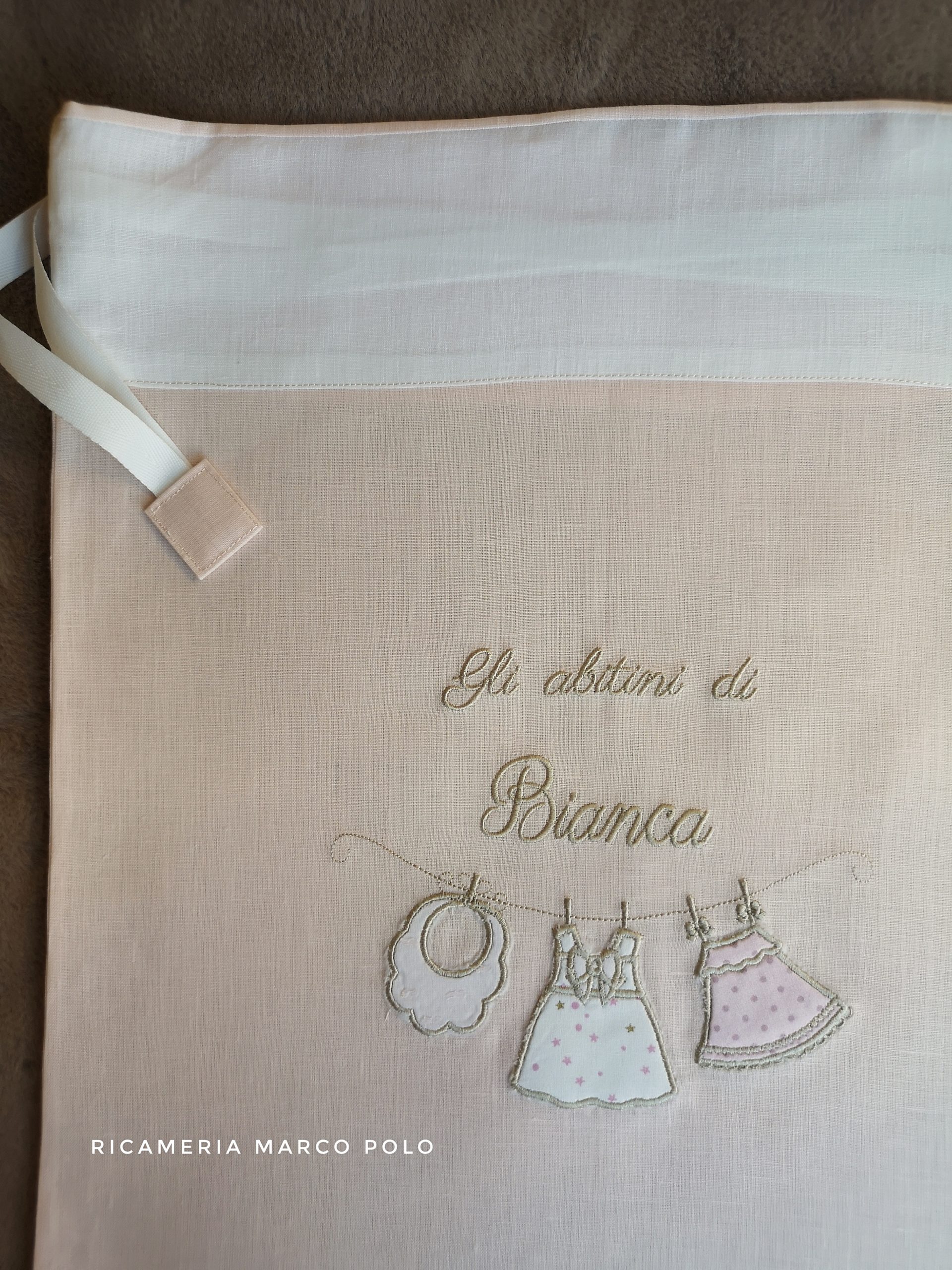Panni stesi al sole ad asciugare, una scritta “gli abitini di…” . Ti presento una sacca delicata, adatta a contenere il primo cambio della tua bimba che sta per nascere, e in futuro per contenere i cambi da portare all’asilo. Questa sacca è realizzata in lino colore pesca, dettagli in panna e tortora.