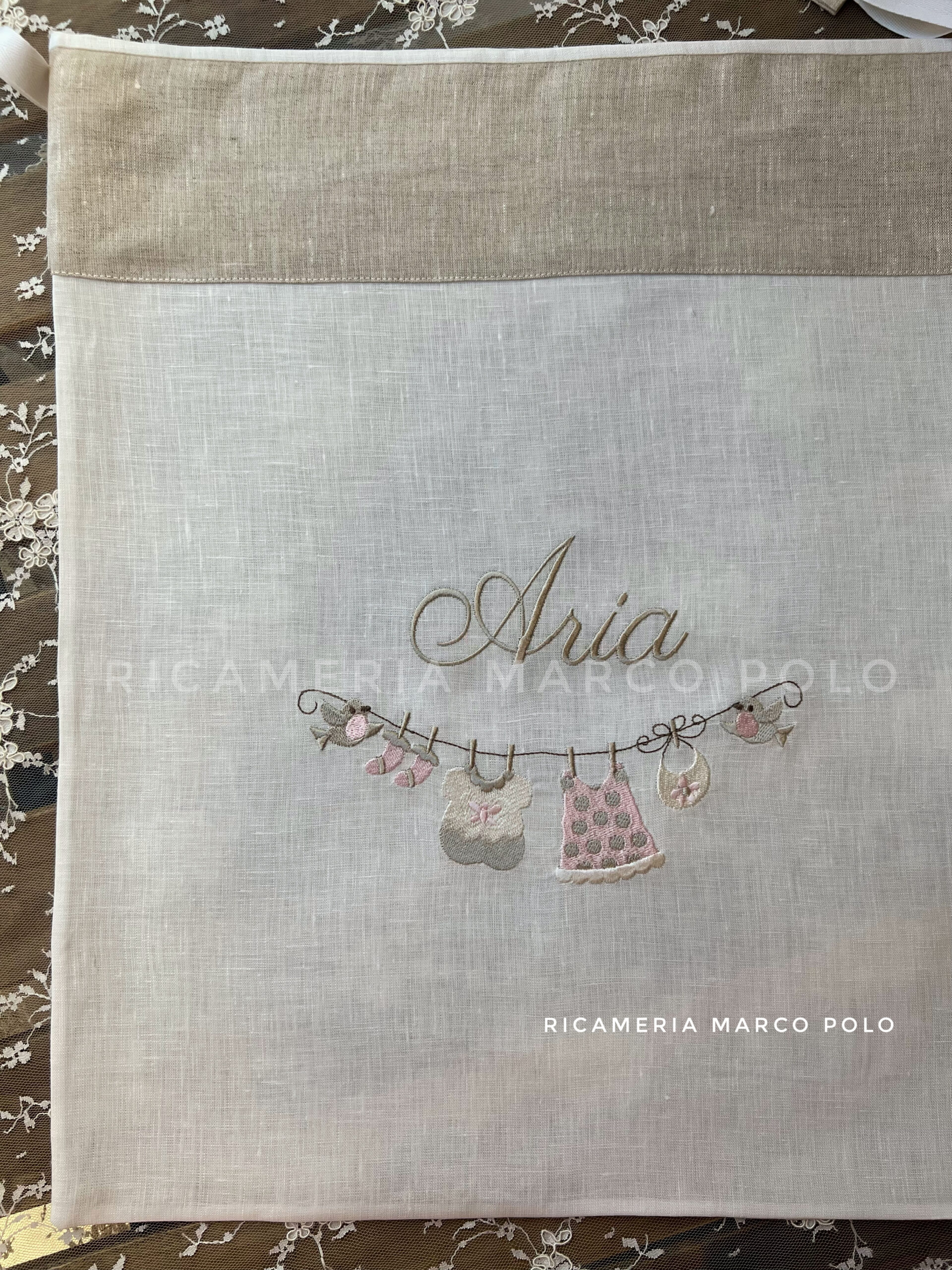 sacca nascita primo cambio in lino panna e tortora con ricamo panni stesi in delicati toni pastello. la sacca è adatta a clinica oppure ospedale, oppure per l’asilo. E’ possibile personalizzarla anche solo con il nome.