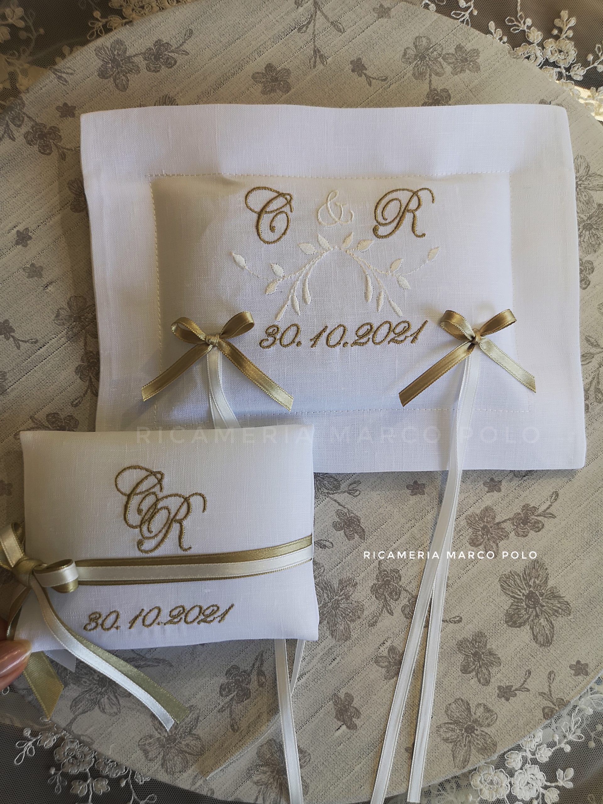 Cuscino Portafedi in puro lino colore panna personalizzato con rami d’ulivo panna. Ricamo iniziali e data in oro chiaro.  Doppio fiocchetto in doppio raso ITALIANO: 16 mm colore oro chiaro, 6 mm colore panna.