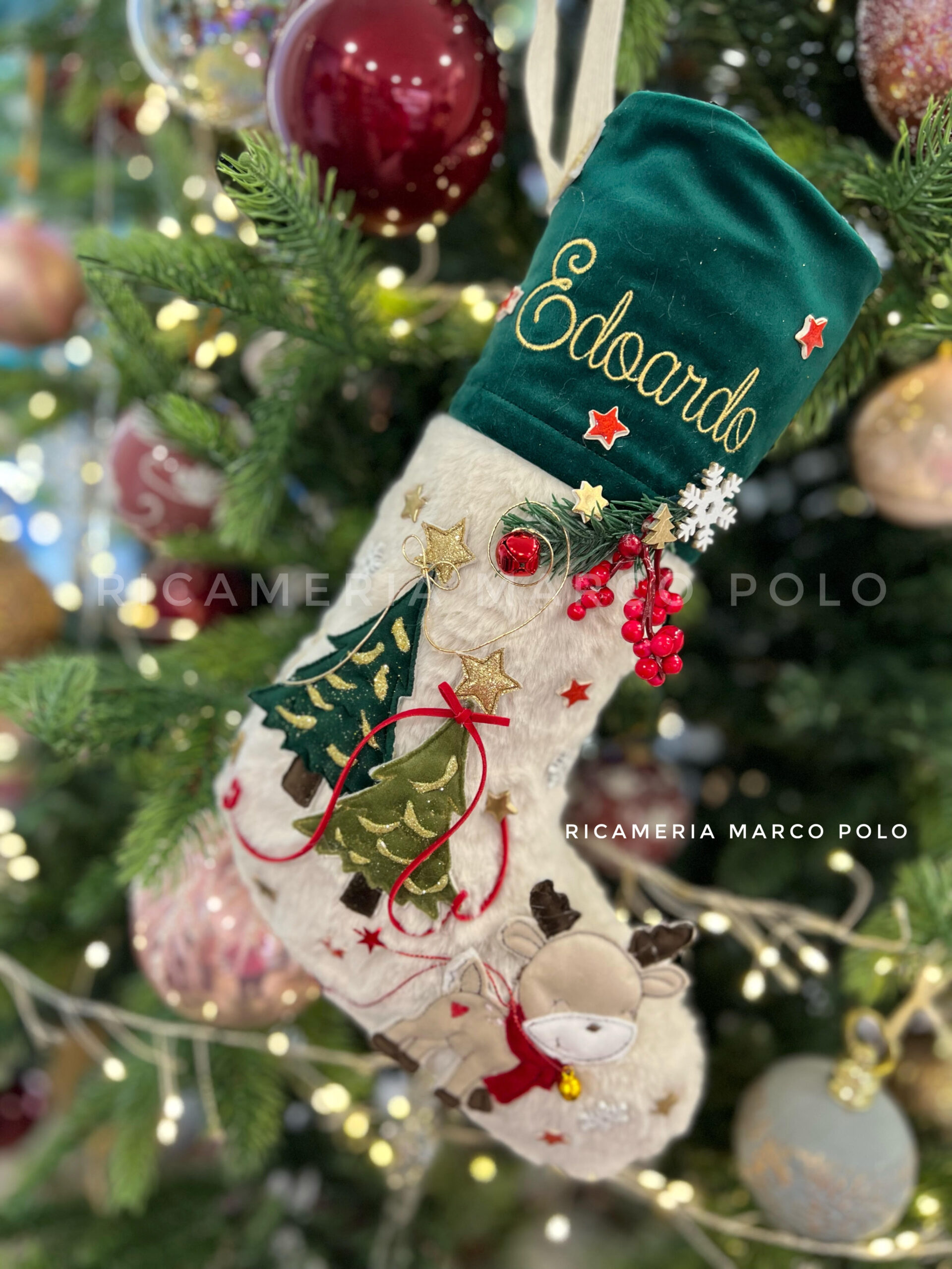Calza della Befana o Calza Natalizia? A te stabilirne l’uso, per noi vanno bene per ambedue le feste, cambia solo il contenuto che vuoi mettere dentro. La calza in foto è realizzata in peluche panna e fascia in velluto verde, la protagonista è una renna che cammina il giorno di natale in mezzo ai pini tutti decorati a mano.
