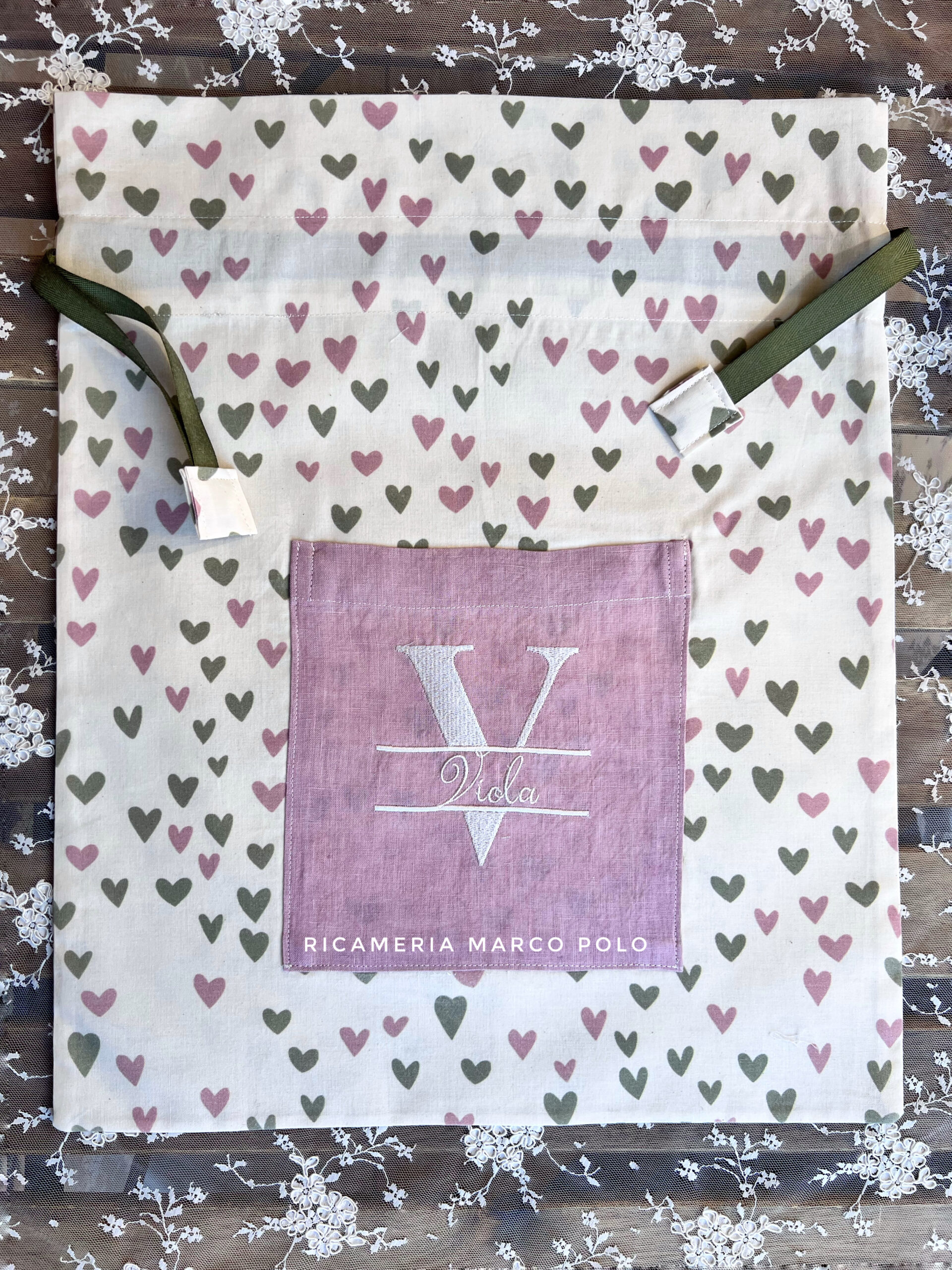 Sacca per il cambio in cotone fantasia cuori, con tasca esterna in puro lino rosa antico e ricamo in bianco dell’iniziale e del nome. Questa sacca è possibile personalizzarla solo con un nome. Anche questa è una sacca adatta a vari scopi: può essere utilizzata per l’asilo, per il primo cambio alla nascita o semplicemente per contenere un cambio