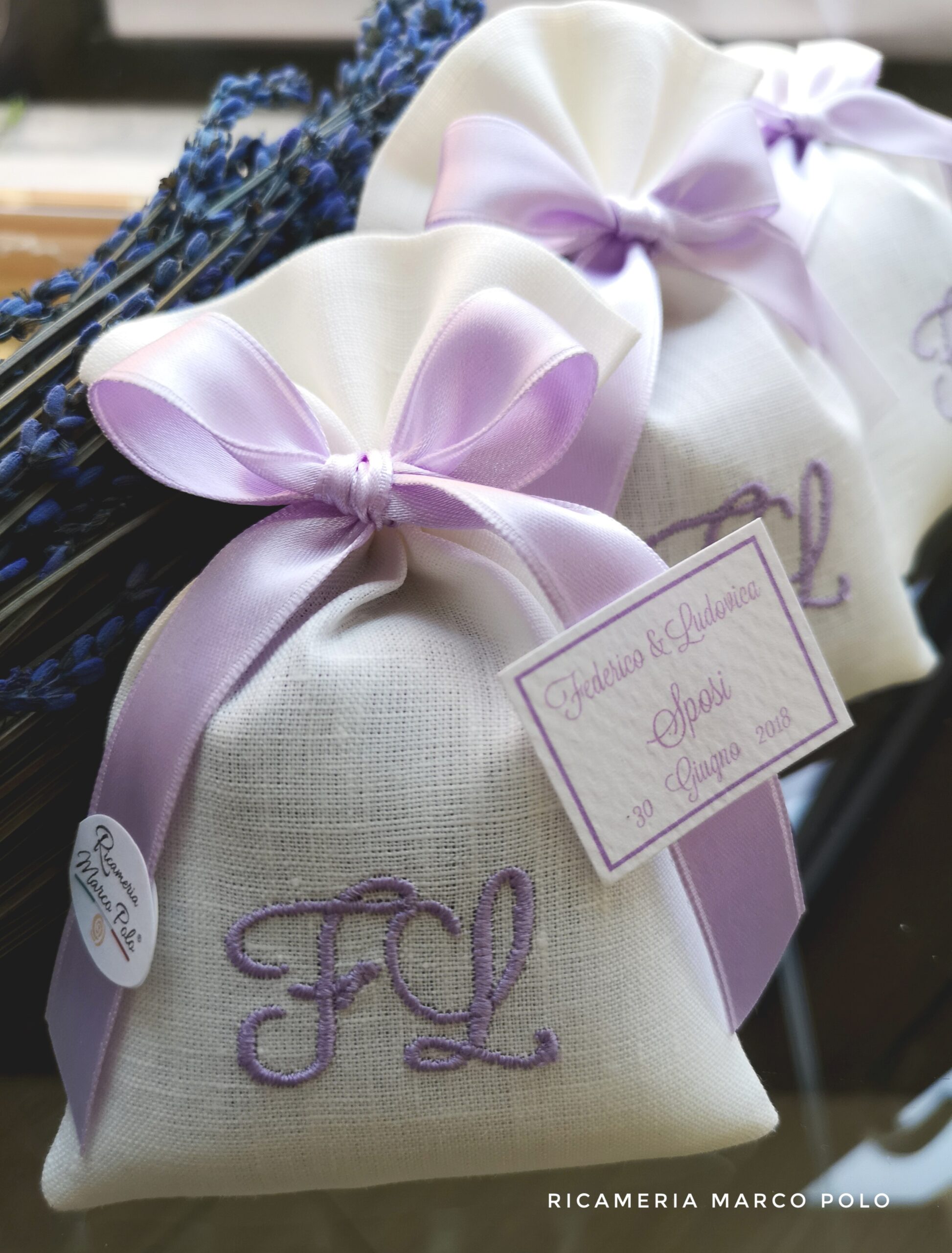 Sacchetto in lino panna con ricamo e nastro 16 mm lilla
