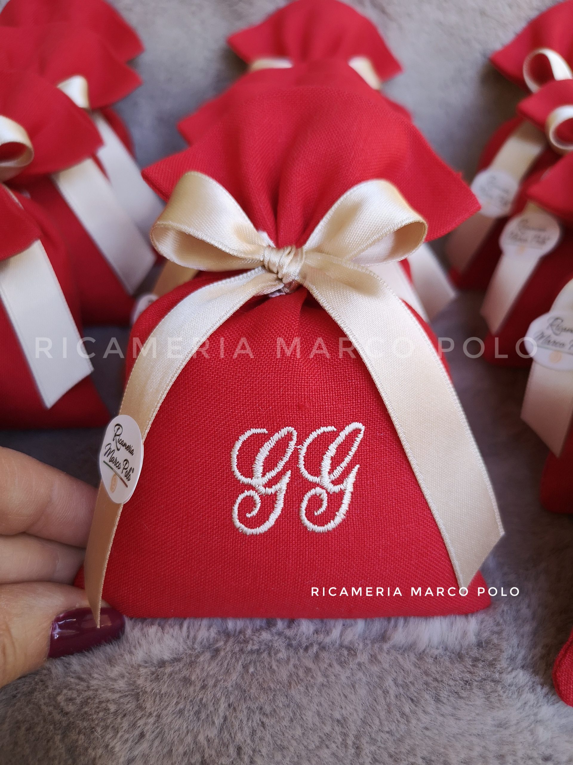 Sacchetto in lino rosso con ricamo e nastro 16 mm nocciola