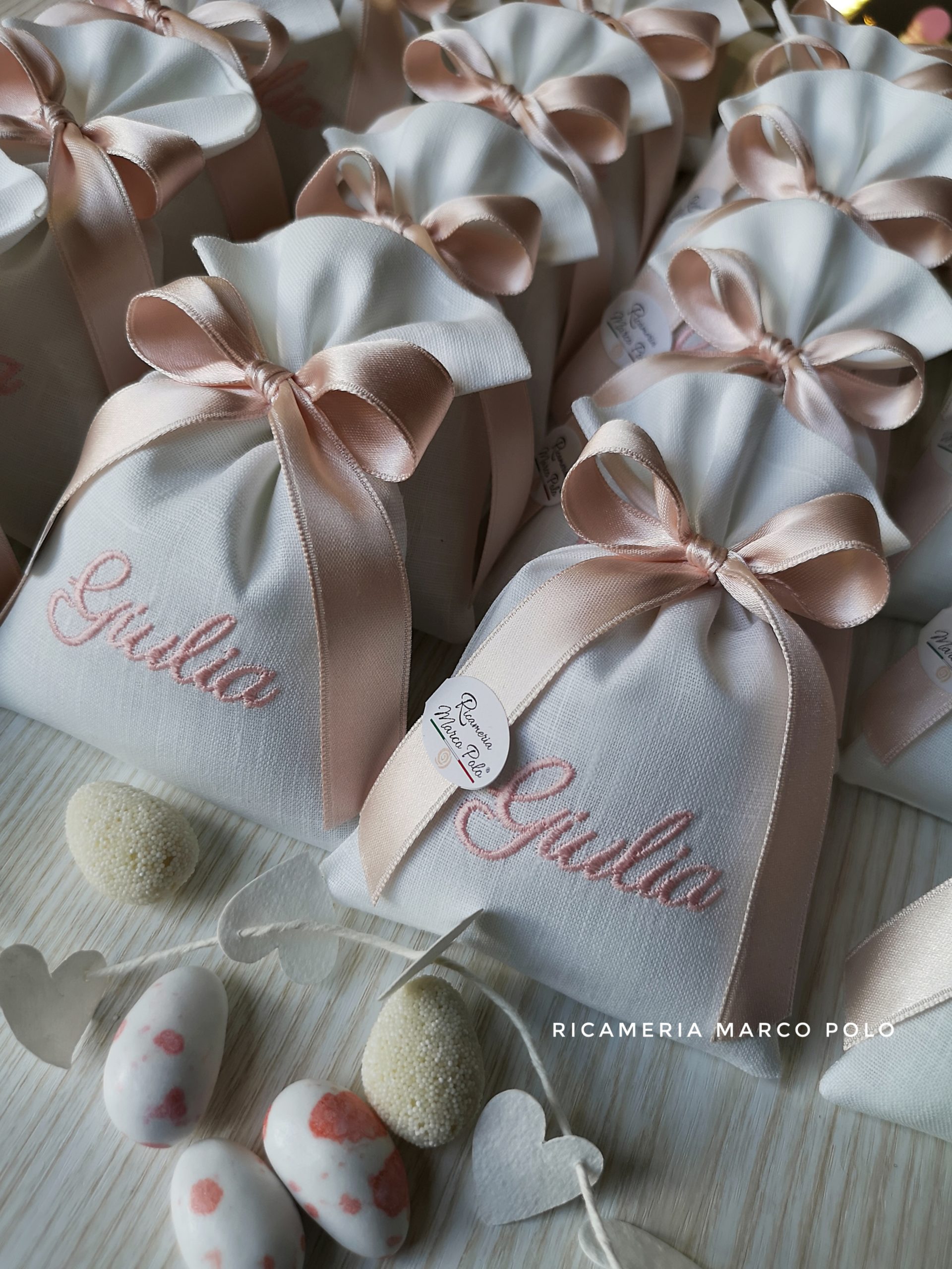 Sacchetto in lino bianco con ricamo e nastro 16 mm cipria