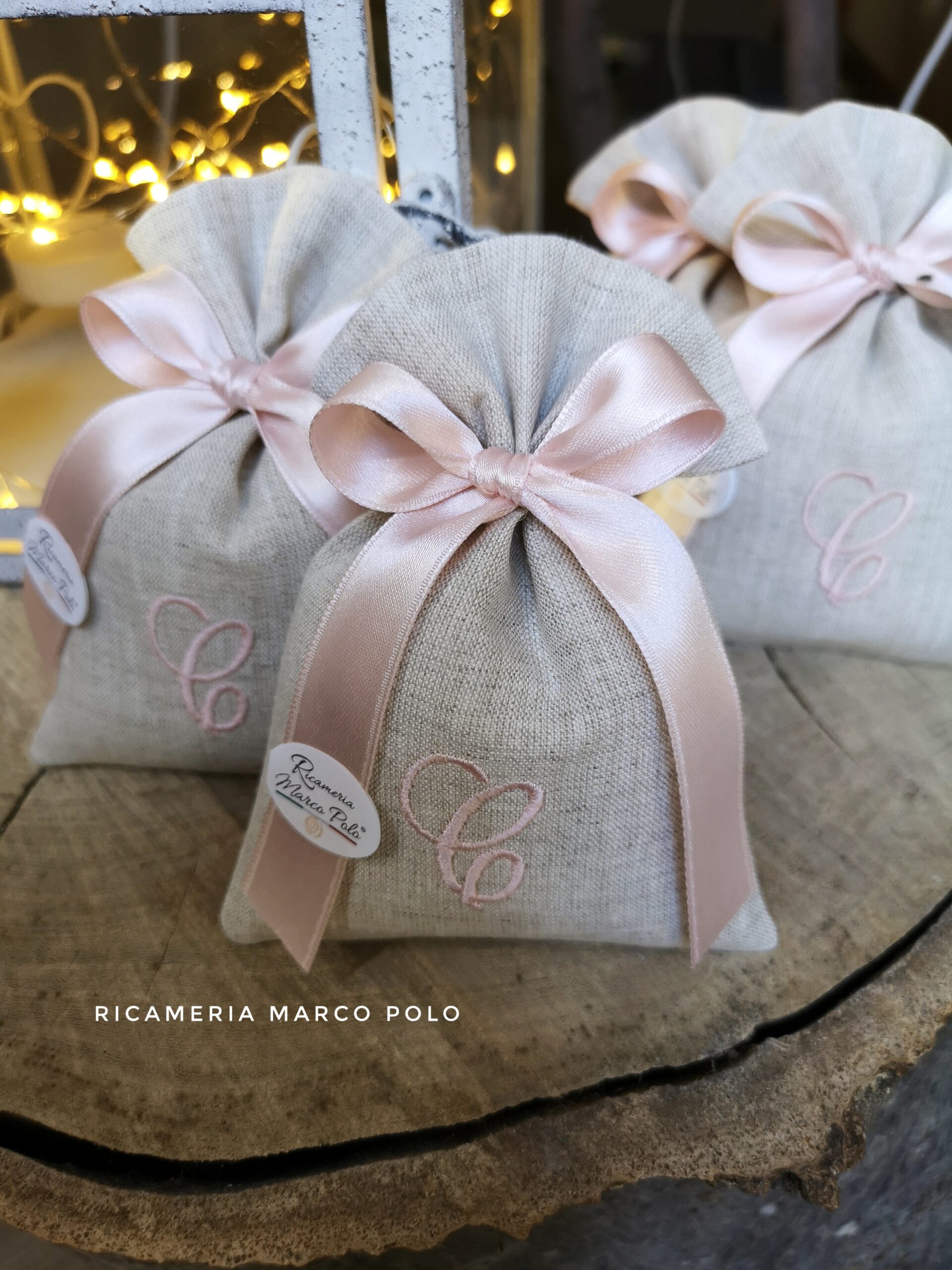 sacchetto in lino tortora con ricamo e nastro 16 mm rosa cipria